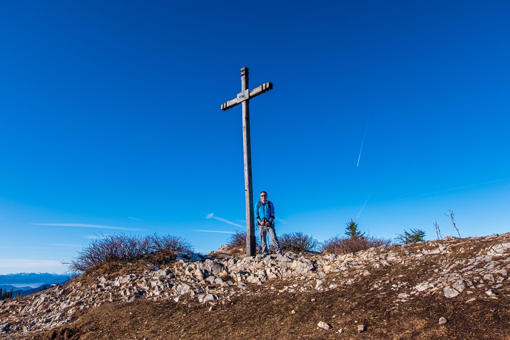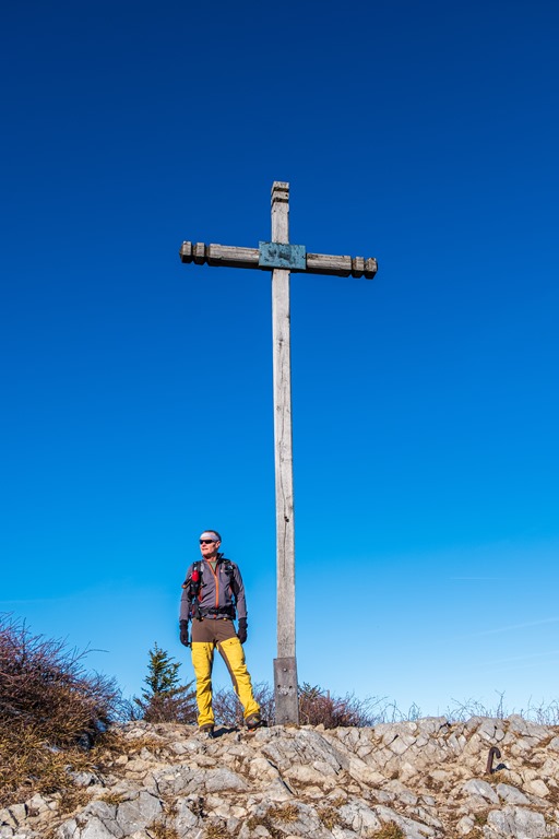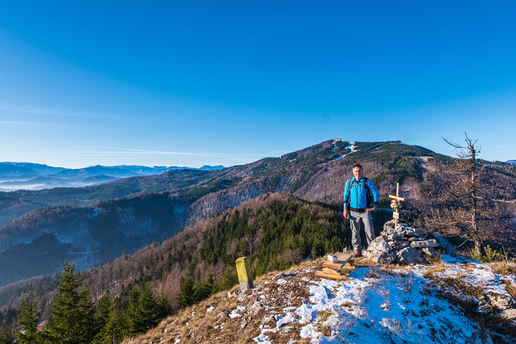 11:30-kor, azaz indulástól számítva cirka 2:30 óra elteltével vagyunk a jó magas csúcskeresztnél. Lenyűgöz a panoráma. Tisztán kivehető az Ötscher, a Muckenkogel, a Rax és a Schneealpe. Egy ugrásnyira a csúcstól van egy pad, ahol letelepszünk és elemózsiázunk a magunkkal hozottakból. Szél sem lebben és tehát nem sietünk, mert annyira gyönyörűséges a táj, olyan kellemesen marasztaló az idő. De mindennek vége szakad egyszer.