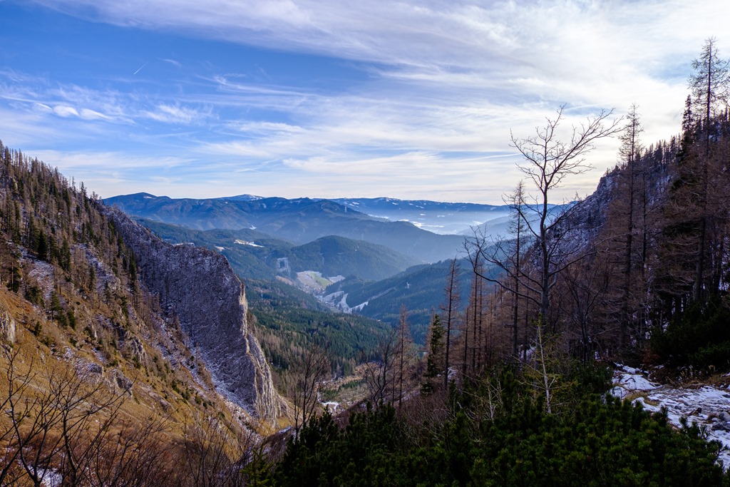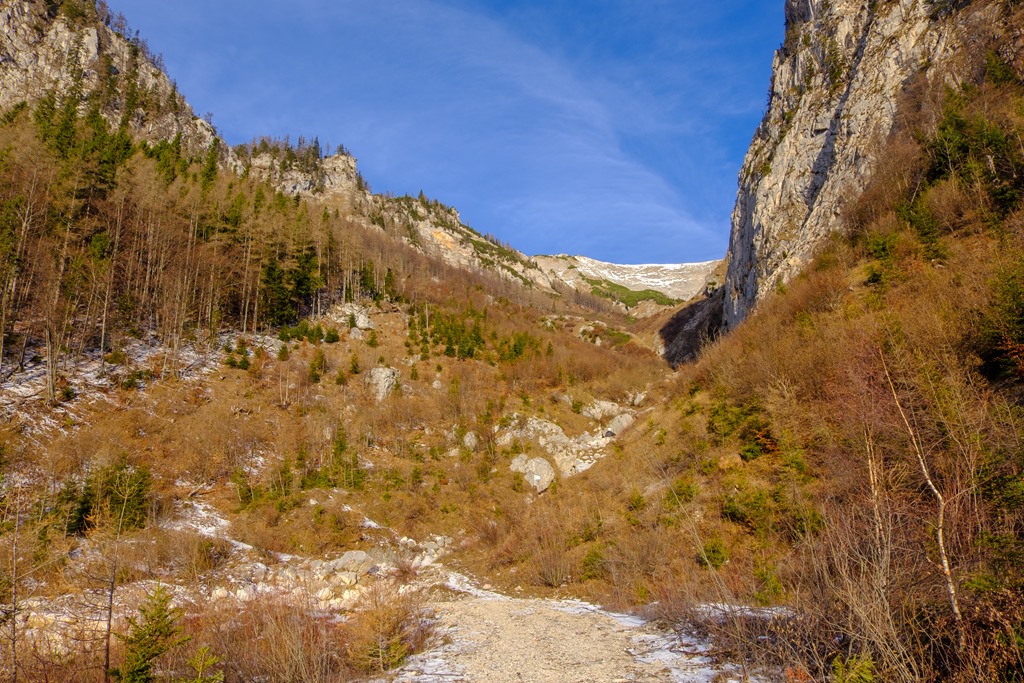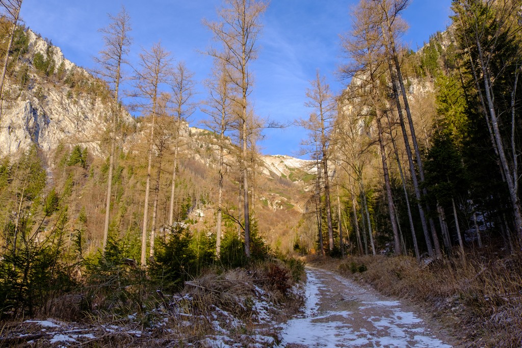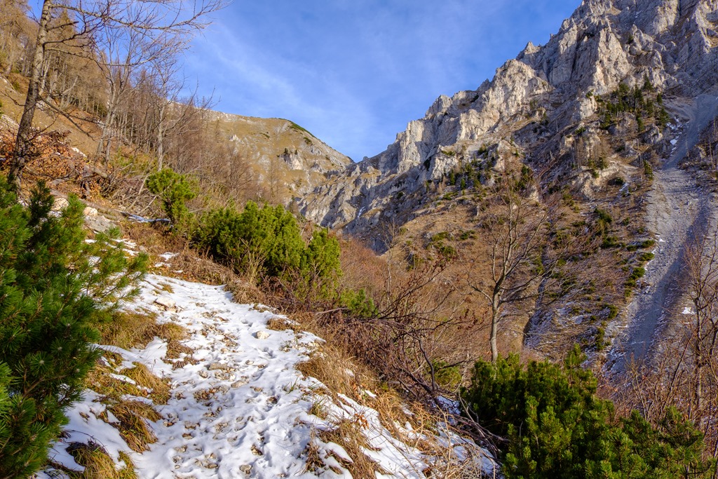 Mivel a tegnapi Unterbergnél jóval magasabbra megyek, téli bakancsra váltok és hozom a könnyű hágóvasat is. Később jó hasznukat lelem. Így a reggeli órákban a sziklaszorosba besüt a nap, minek köszönhetően, kivilágítva szerencsére elég barátságos arcot nyújt.
