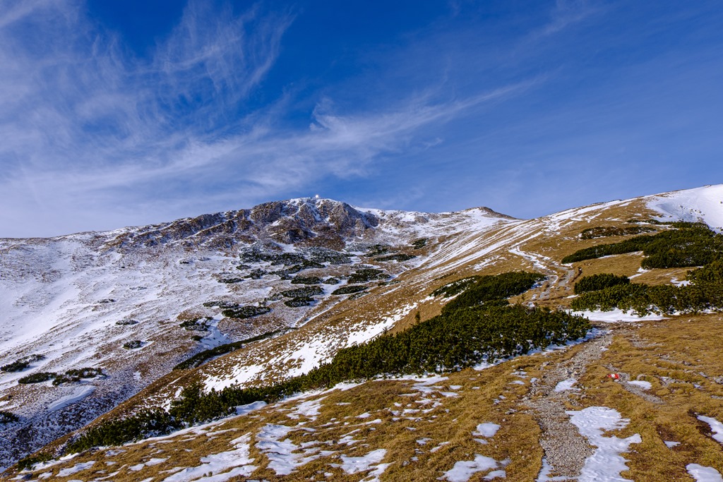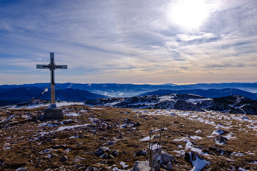 Ahogy közeledem a napon erősén csillogó kereszthez (fenti kép közepén), a szél mintha valamelyest enyhülne. Tán mert a csúcs leárnyékolja a nyugati fuvallatokat. Próbálok hómentes szigeteken lépkedni, ami nem mindig sikerül. A szél a mélyedésekben rakta le a hó nagy részét. Időnként kénytelen vagyok átgázolni egy-egy ilyen horpadáson. A gerincen aztán telibe talál a nyugati szél. 11:20-kor érem el aznapi célom, azaz indulástól számítva nem egész 2:30 óra elteltével. A szél miatt nem is maradok odafenn sokáig. Épp csak kattintok egynéhány képet, aztán máris szaladok lefelé.