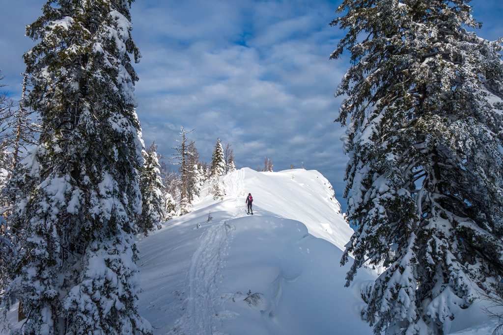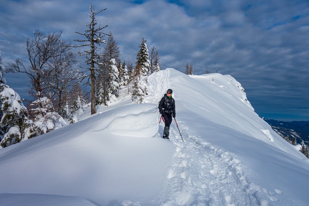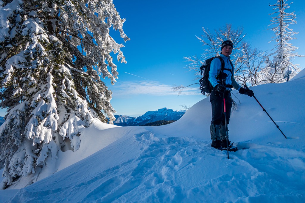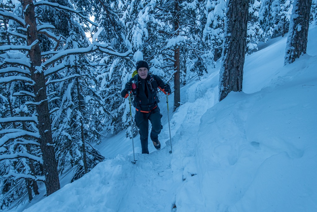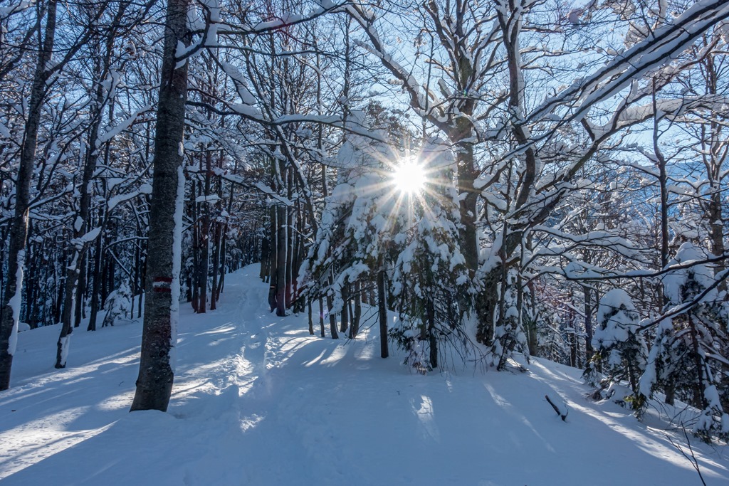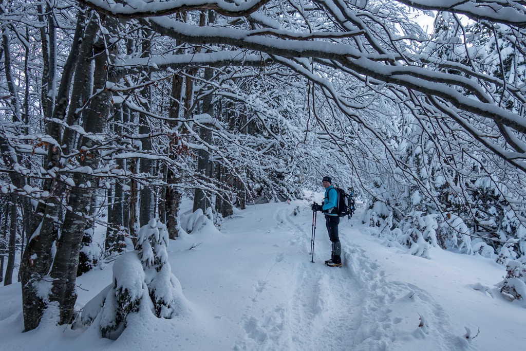 Mivel az ösvény amin haladunk jól ki van taposva, a hótalpainkat az elején még a hátizsákra erősítve visszük. A vidék egy mesebeli Winter-Wunderland a javából. Az út fölé behajló ágakat lehúzza a hóteher díszítés. A völgyben 20-25 centi, odafenn pedig akár egy méteresre is tehető a hótakaró vastagsága.
