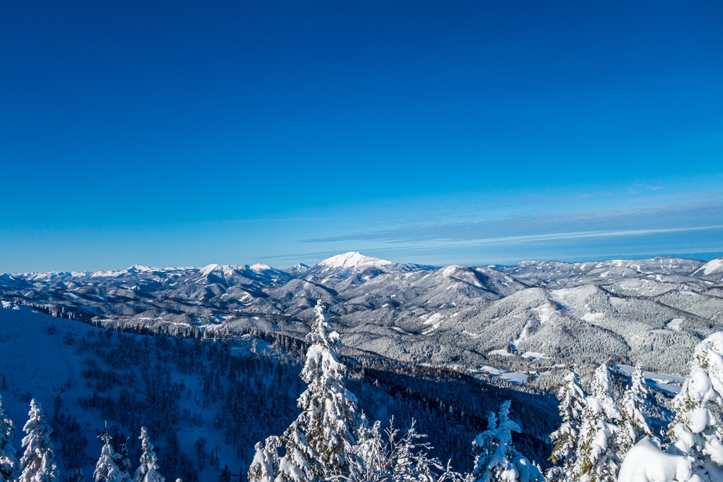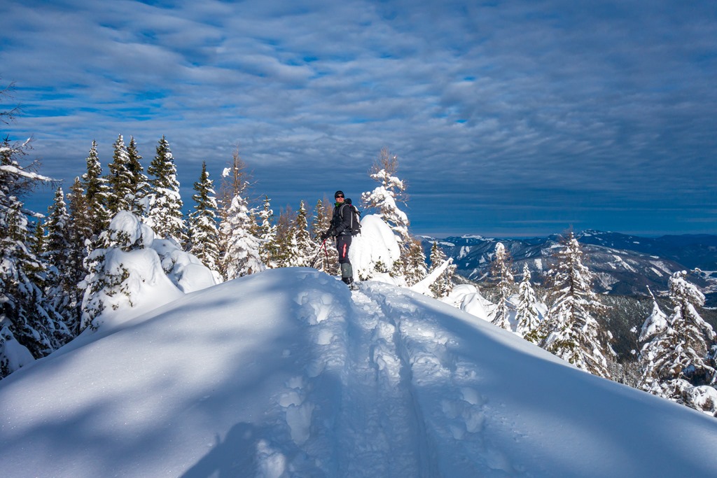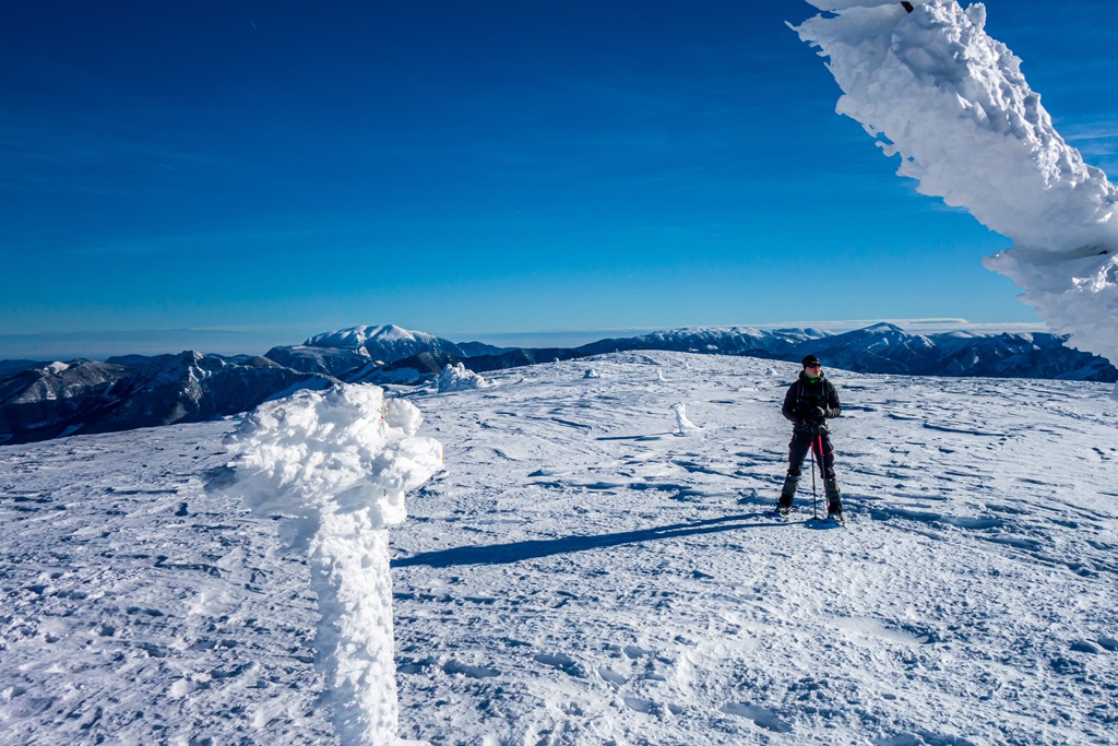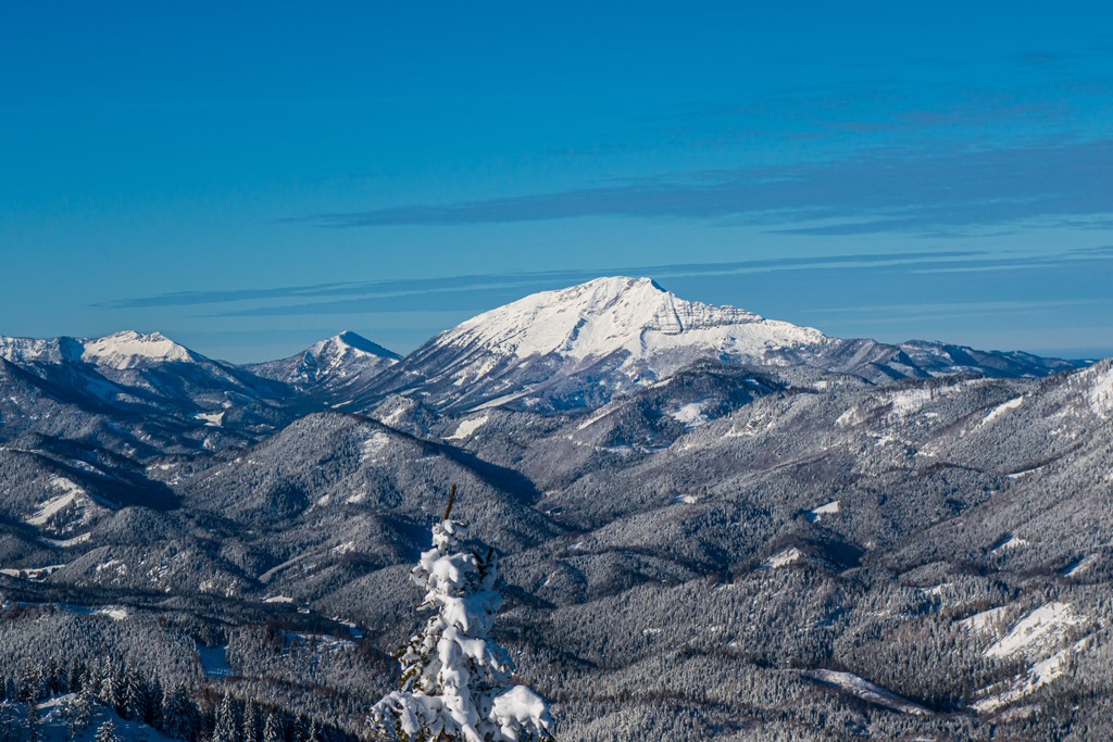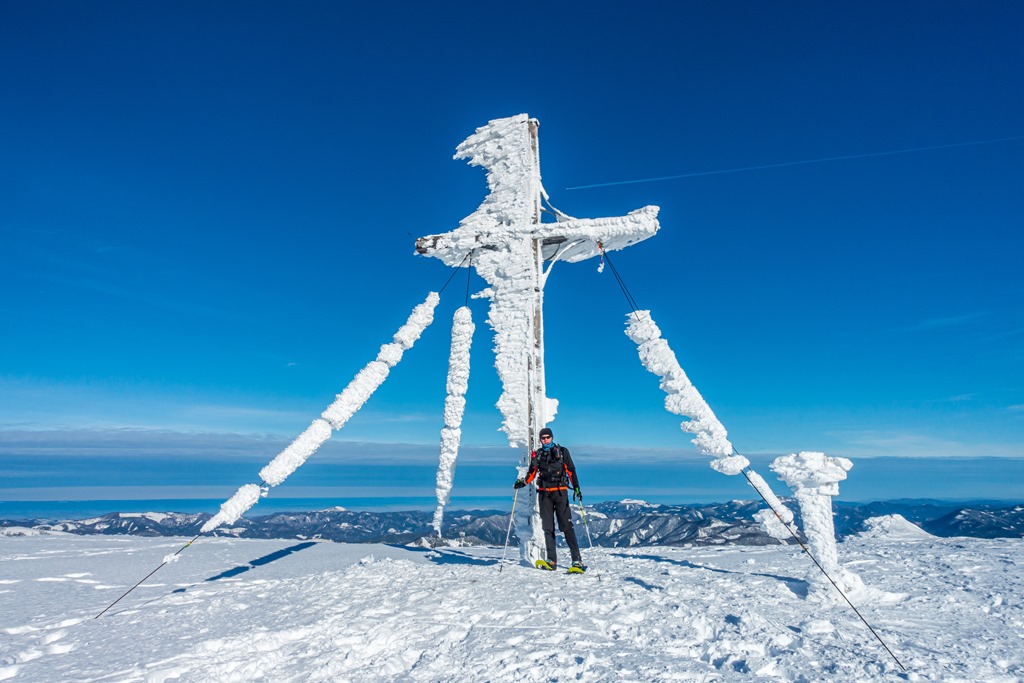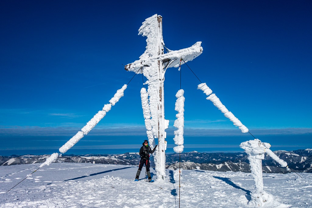 Cirmi jóval előttem felér a hegy tetejére, ahol egy csodaszép jégbe fagyott csúcskeresztben lelhetjük örömünket (11:40). A panoráma pazar. A száraz, tiszta levegőnek köszönhetően minden irányban jól kivehetők a távoli hegyek. A vidéket uraló Ötscher, mellet a Gemeindealpe, a Dürrenstein, a Hochschwab, a Schneealpe, a Rax, és persze a cukorkupoláiról félreismerhetetlen Schneeberg.