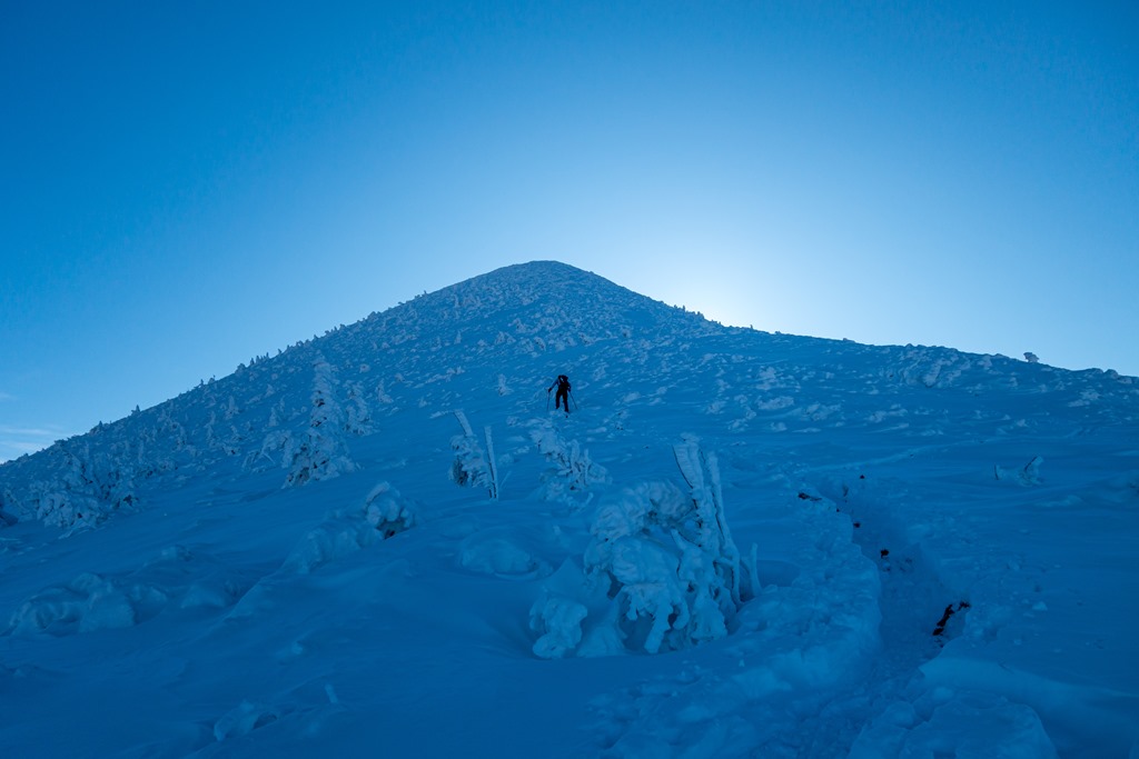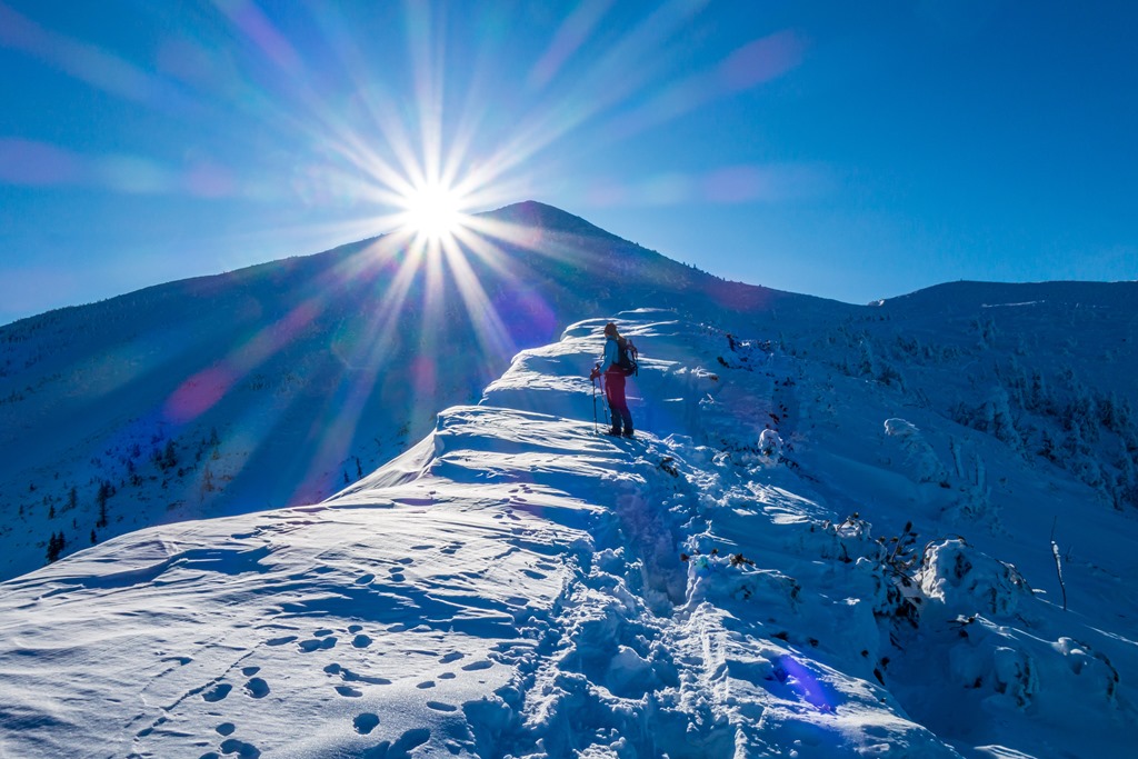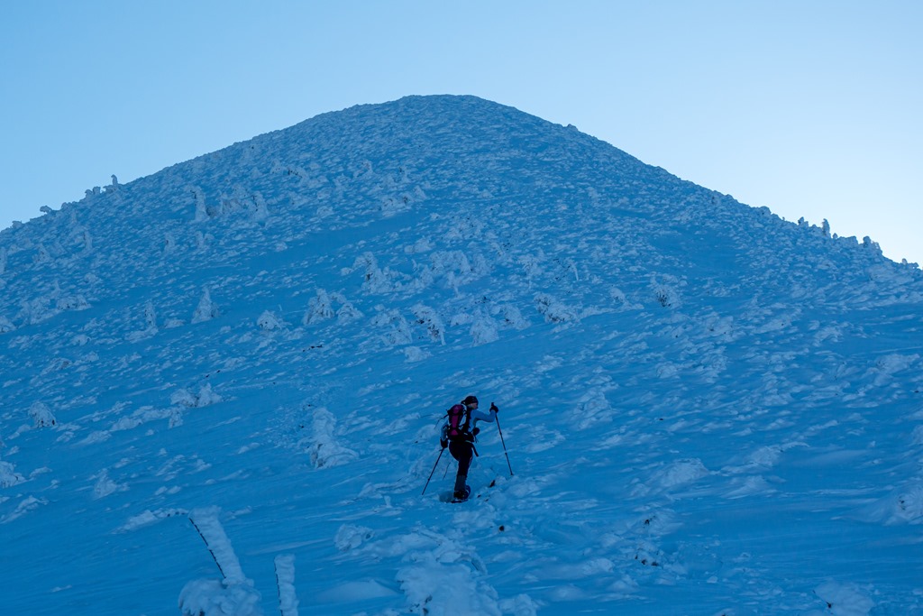 Egyelőre árnyékban menetelünk, mert a északról közelítjük célunkat. A hegy gerince mögül azonban, szemközt, hamarosan kibukkan a vakító napkorona, mely aztán elkísér egészen a legutolsó és egyben legmeredekebb felszökésig. De meséljenek tovább a csodás téli képek.