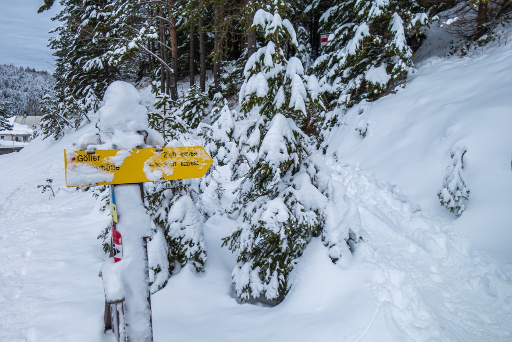 Kernhof/Gscheid község határában, egy jól látható kápolnával szemben van egy kicsiny parkoló, ahonnan 9:20-kor indulunk. Vacogtató -8 C fokos a fagy. A hó, lépéseink nyomán hangosan csikorog. Már régen hallottam ezt a muzsikát. A közelben levő sífutó pályák (Loipen) is nyitva vannak, szintúgy a Göllerlifte mini síterep.