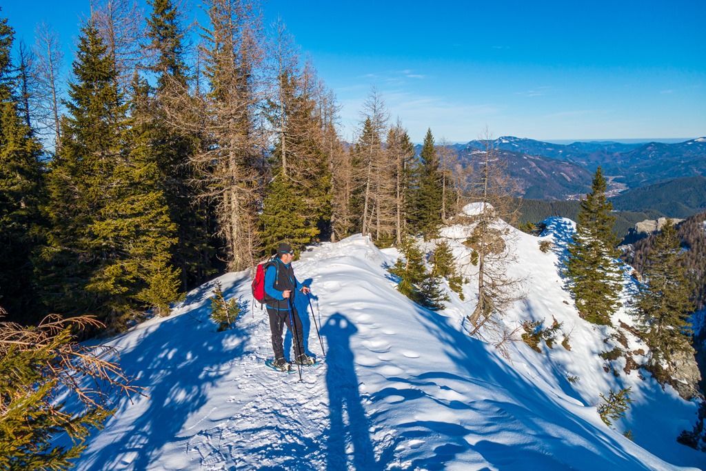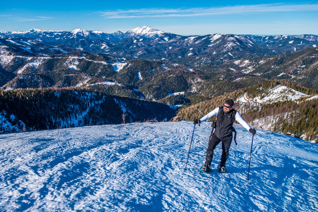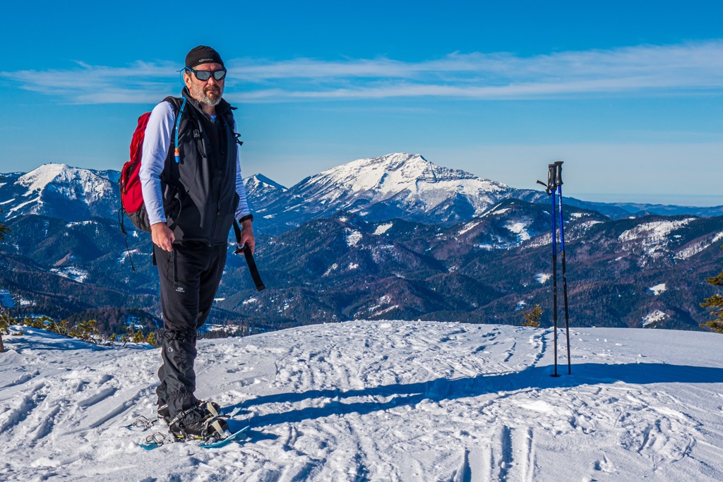 Először el kell érnünk a közeli (cirka 700m) Göllerlifte mini-síterepet, és tehát az országút szélén sietünk a fagyos reggelen. Tán egy negyed óra múltán az eljegesedett sí-lejtők tövében vagyunk és a hágóvasaink felvételével foglalatoskodunk.