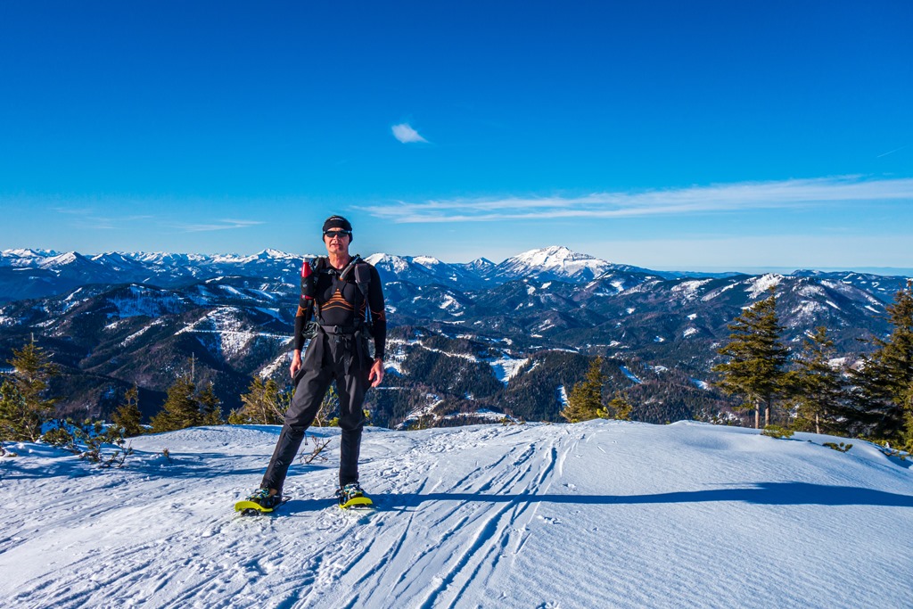 A 2019-es évzáró Göller-túra napján Attila sajnos nem ért rá, így most újratöltöttük a dolgot, mégpedig a kiadósabb és mindenképpen szebb variáns mentén, a Hohes Bärenecken (1597m) át. A túráról érdemes tudni, hogy nem követ jelölt turistautat, mert ilyen ott nincs. Az út tudtommal csak télen járható, amikor a hó befedi a törpefenyőket. De meglehet, hogy tévedek és van összefüggő rés a bozóton. Tudniillik egy helyen piros pöttyöket fedezünk fel egy széltől hómentesített sziklán, ami egy ösvényt sejtet. Ennek tán, majd alkalomadtán, érdemes a végére járni.