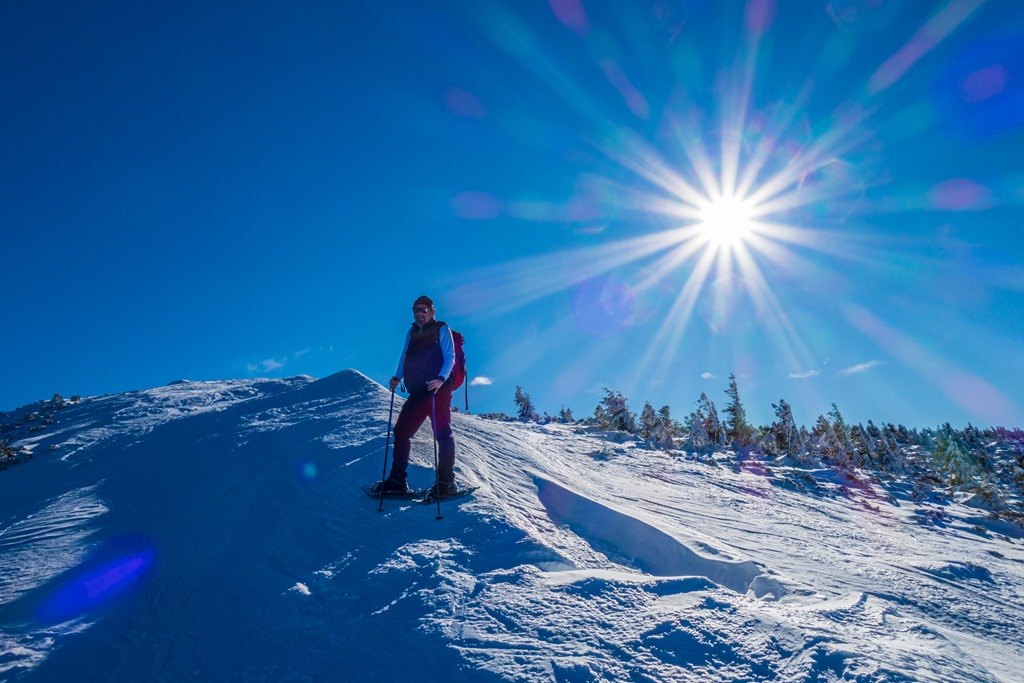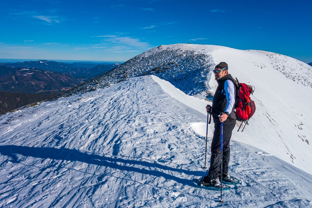 Az elmúlt napok ismétlődő olvadás-fagyás ciklusai nyomán egy kemény, jeges réteggé alakult át a hótakaró, így még a sípályák után is maradunk a hágóvasaknál. Később azonban, kezdünk be-beszakadozni, ami váltásra kényszerít és tehát felvesszük a hótalpainkat. Az út fonalát szerencsére nem kell keresgélnünk, mert a korábban erre járt sítúrázók világosan kijelölték a haladás helyes irányát. Itt-ott, különösképpen pedig keskeny és kellemetlen traverzokat kikerülendő megpróbáljuk toronyiránt levágni a hajtűkanyarokat, több-kevesebb sikerrel. Amint elhagyjuk a jól kitaposott nyomokat, máris elnyel a kéreg alatt még ugyancsak mély hó.