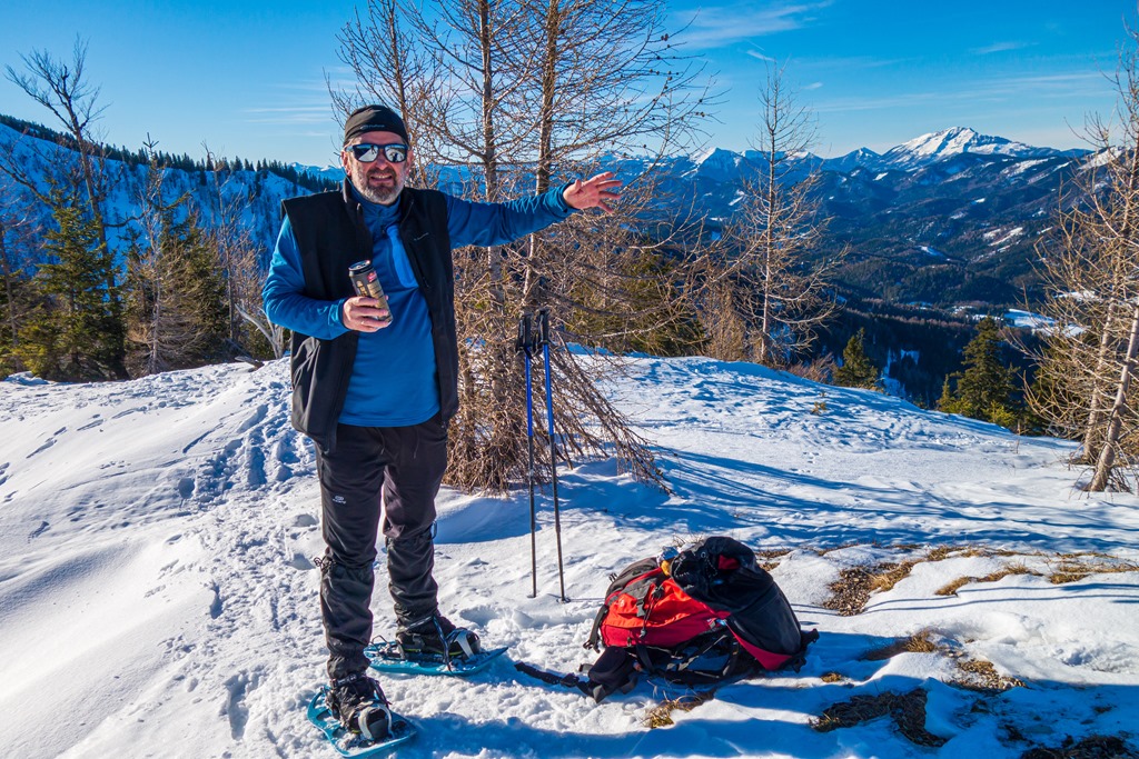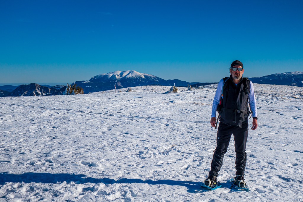 12:35-kor érjük el a Göller csúcsát. Szép téli nap lévén tucatnyi sítúrázó rohamoz. Annyi bizonyos, hogy egyikük-másikuk gondokkal fog küzdeni lefelé menetben. Nem kerüli el a figyelmünket, hogy különösen azokon a részeken, ahol a domb lejt, néhányan nagyon bizonytalanul mozognak. Nos, így-e avagy úgy, az ö dolguk, mi, hótalpainkon, szerencsére problémamentesen és főleg biztosan érkezünk célba.