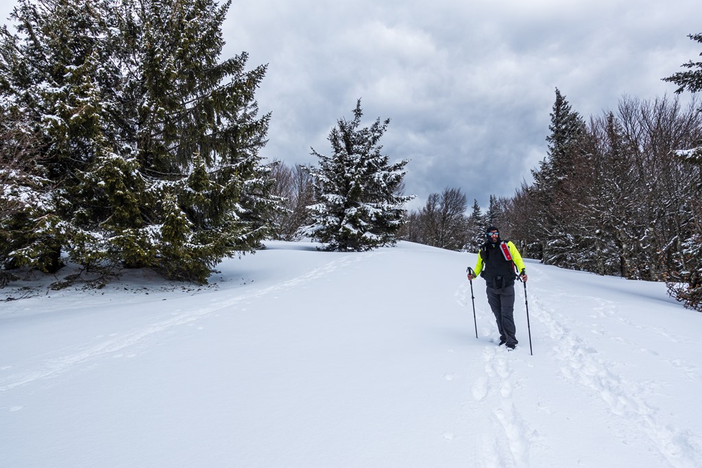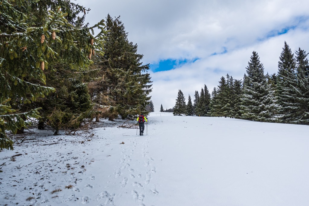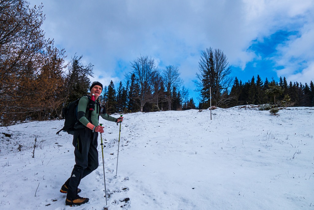 Odalenn annyira barnul minden, olyan távolink tűnik a tél, hogy a hótalpainkat az autóban hagyjuk. Ez mint később kiderül, annak ellenére sem okoz gondot, hogy feljebb, nem igazán számítunk vele, ugyancsak kövérke hótakaróra lelünk.