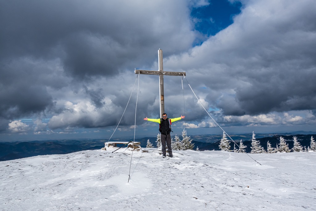 Itt-ott, a felhők mögül ki-kikandikáló napsütés támogatásával érkezünk a most sajnos bezárt menedékházhoz, majd a csupán csak egy ugrásra levő csúcskereszthez (11:40). A szürkehasú felhők és bágyadt nap játéka nyomán különleges, nem mindennapi hangulatú fotók készülhettek. Íme!