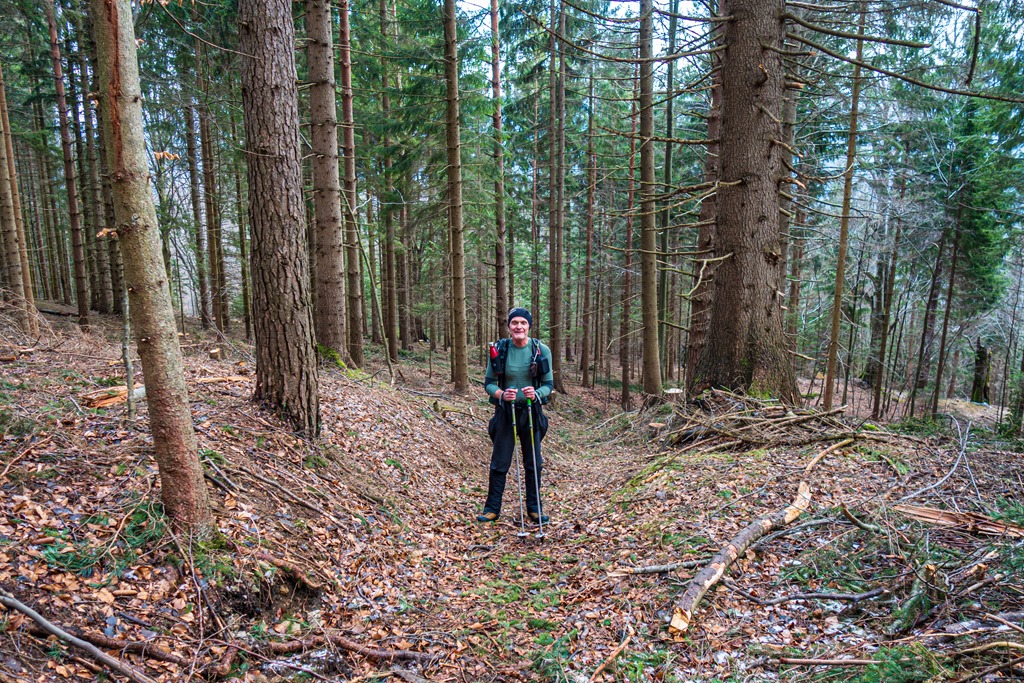 Visszafelé (12:10) a hegy jóval meredekebb túloldalán ereszkedünk le. Na, itt aztán, egy északi oldalt meg nem hazudtolva, még több a hó. Még a Kleinzeller Hinteralm előtt rátérünk a Brennalmra visszavezető erdészeti útra. Itt jóval barátságosabb és főleg szélcsendes az idő.