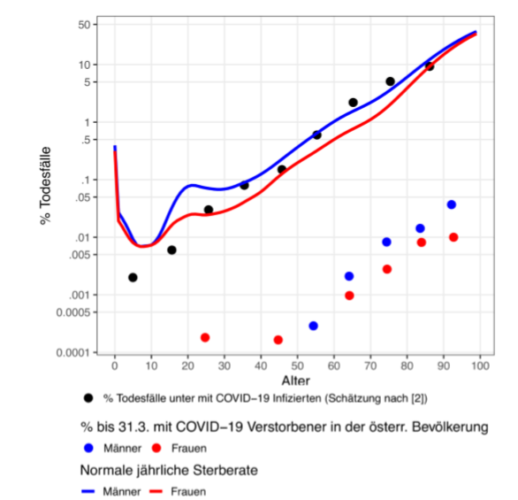 Szó szerint ezt írják „Vergleichen wir das Sterberisiko für COVID-19 Infizierte mit den normalen jährlichen Sterberaten füur Österreich, sehen wir auch hier eine Übereinstimmung – das geschätzte Sterberisiko mit COVID-19 entspricht in etwa dem normalen Risiko innerhalb eines Jahres zu versterben” == (szabadfordításban) Ha összehasonlítjuk a koronavírus fertőzöttek elhalálozási arányát a rendes évi átlaggal, akkor nem látunk különbséget, illetve az elhalálozási rizikó azonos szinten van.