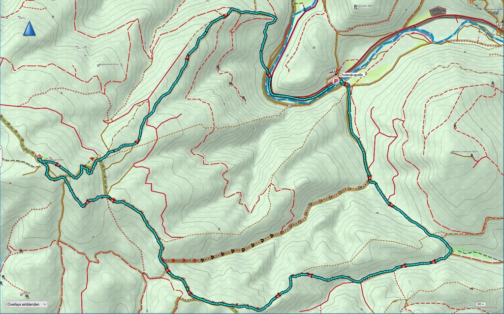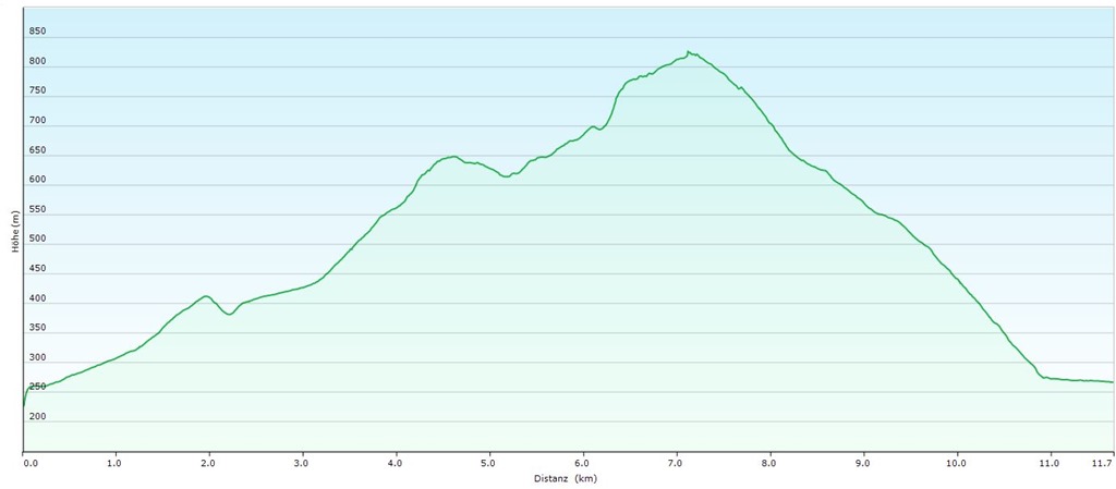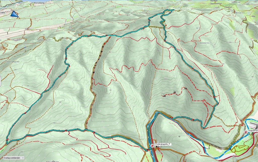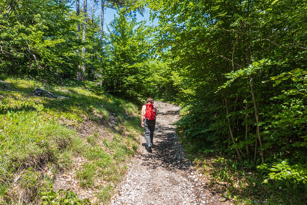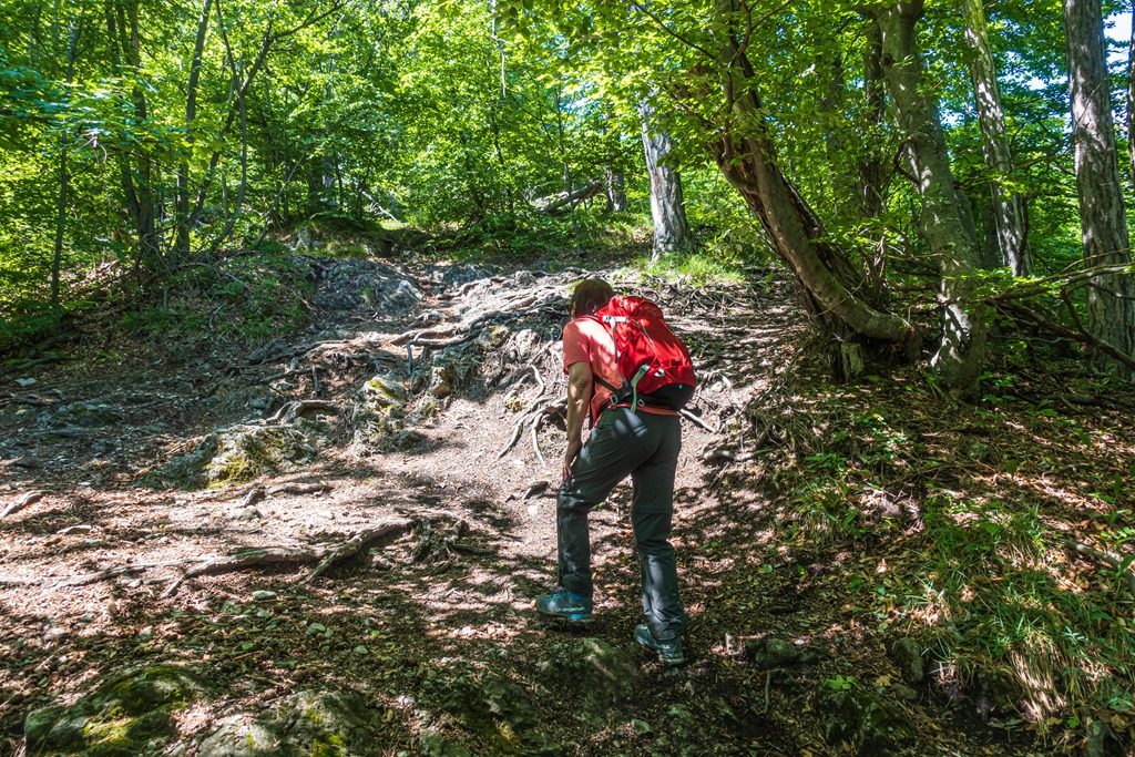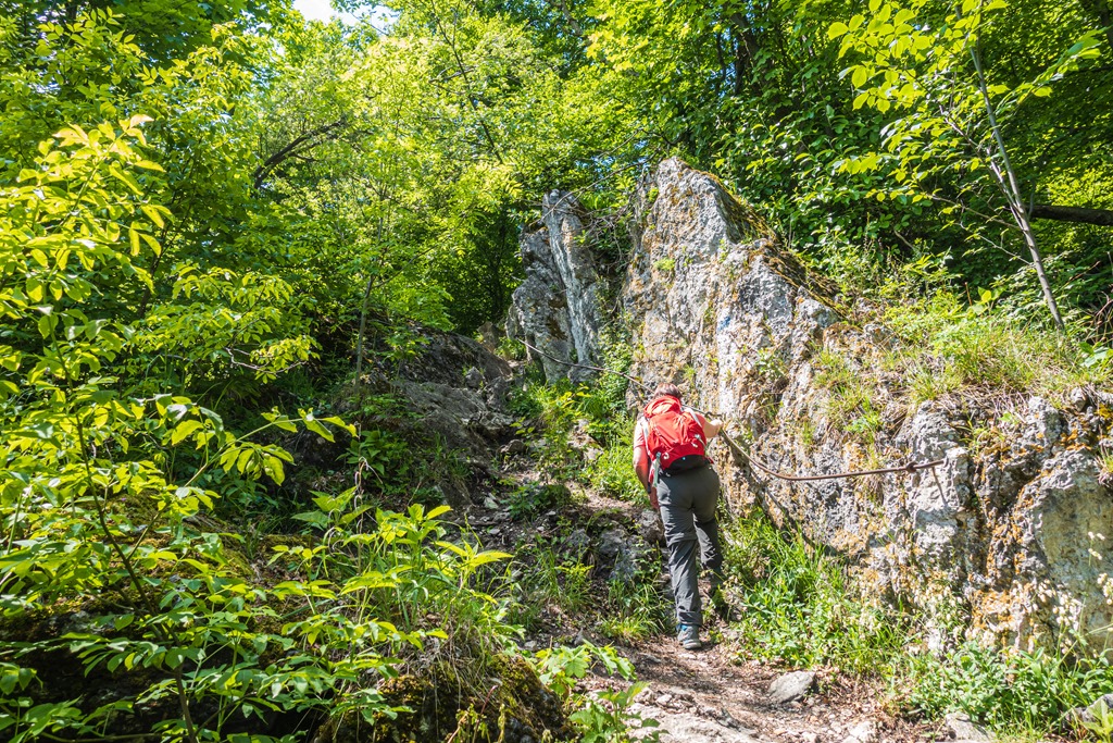 A szelíd és mérsékelten emelkedő Kalkgraben helyett elbandukolunk a Jägerhausig (ami egy nagyobb épület az erdészeti út mentén) és ott jobbra fordulva cserkésszük be az Äußerer Kaltenberger Forst néven ismert erdőrészt. A turistaút egyes szakaszai meglepően nyers, alpesi jellegű sziklalépcsőkkel tarkítottak (lenti kép).