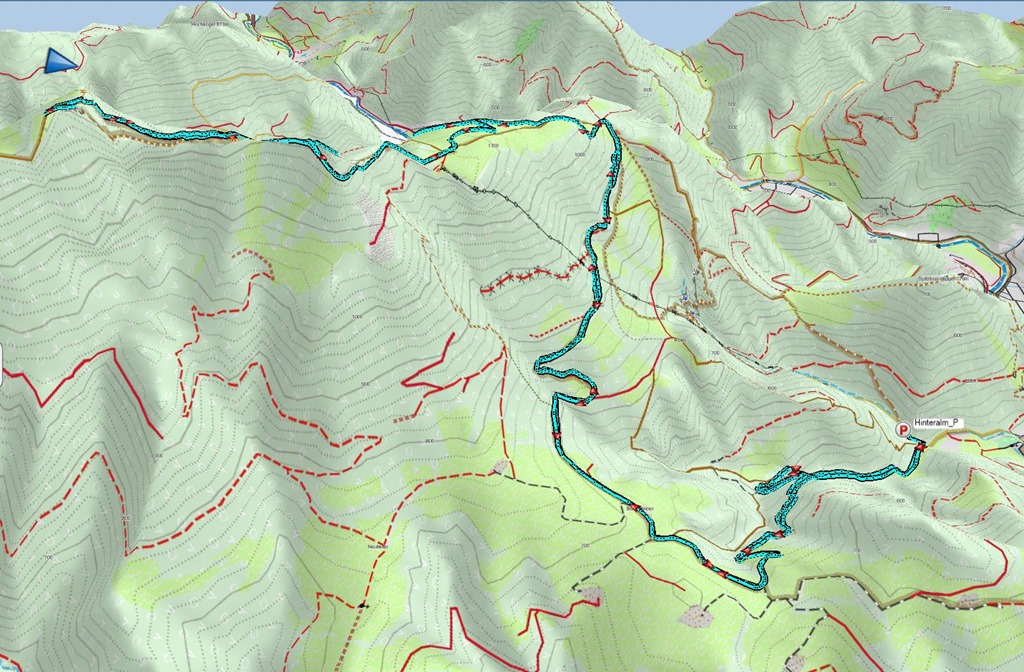 Az út első szakasza aszfaltburkolatú. Itt-ott személyautók előznek. A cirka 700 m szinten levő, túrázóknak szánt parkolóba igyekeznek. Valahol a Klosterebenkapelle és a parkoló között elfogy az aszfalt és döngölt erdészeti úton haladunk tovább. Elérjük az említett parkolót, melynek a végében egy hajtűkanyarban balra fordul az út szalagja. Később rendre elhaladunk a Lilienflederhütte mellett, majd némi lazább terep után következik a Muckenkogel alatti legmeredekebb kulcsszakasz. Sikerül nyeregben maradnom, pedig az út ugyancsak nagyot kunkorodik ott felfelé. Az ebadta!