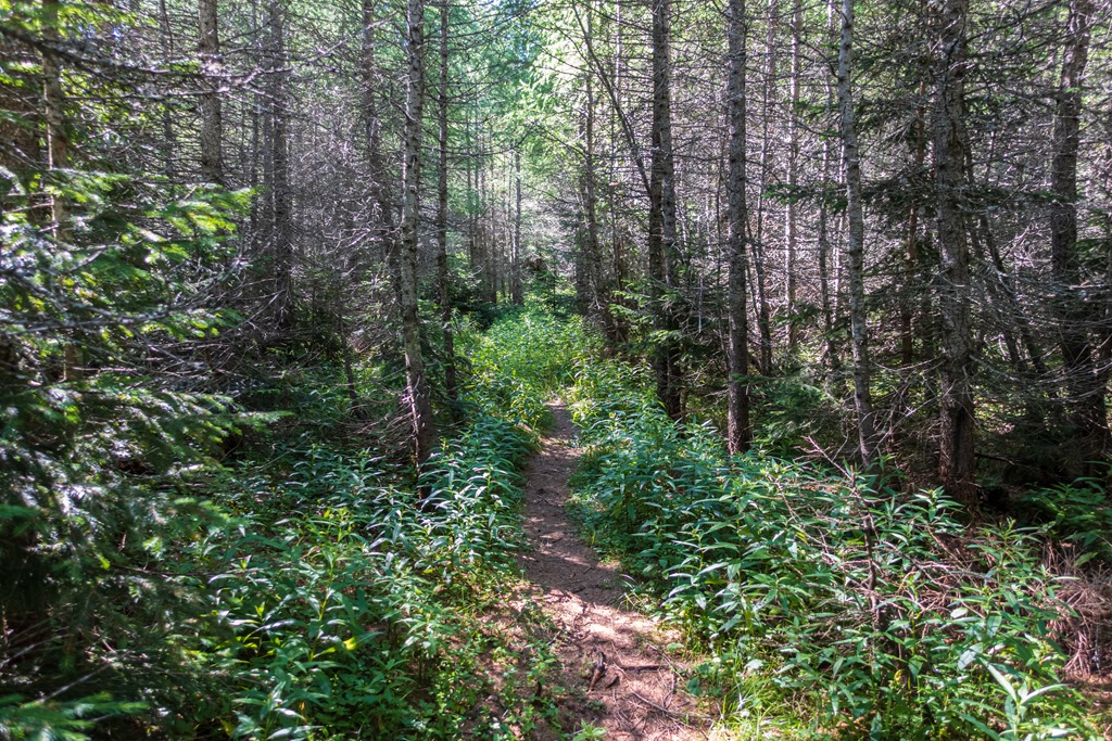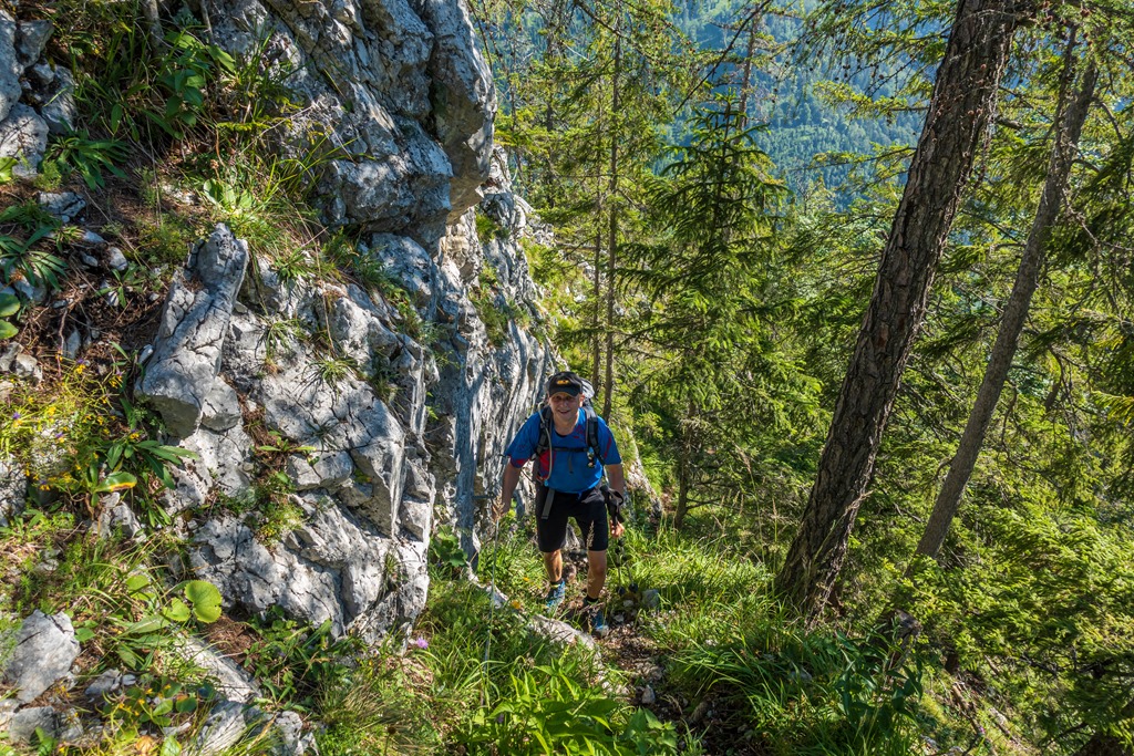 Gyöngyözik, majd rendesen csurog is rólunk a verejték mire felküzdjük magunkat a meredek emelkedők végét jelző fiatal vörösfenyő erdőig (9:50). Közben is akadnak áldásos árnyékot osztogató szakaszok, de idefenn az erdő koronái alatt ezen túl is mesebeli a hangulat, híre-hamva sincs a korábbi hőségnek (fenti kép). Ez a csodaország eltart majdnem a Klobentörlig (10:55), ami egy szerényebb árok a Kloben (1697m) hegy és a Scheibwaldhöhe (1943m) között. Erre a bizonyos Klobenre nem vezet semmiféle út, nem úgy a lapos Scheibwaldhöhere.