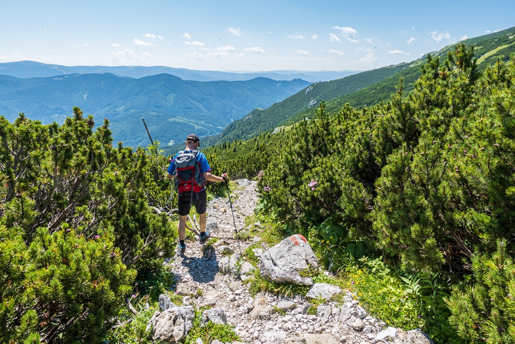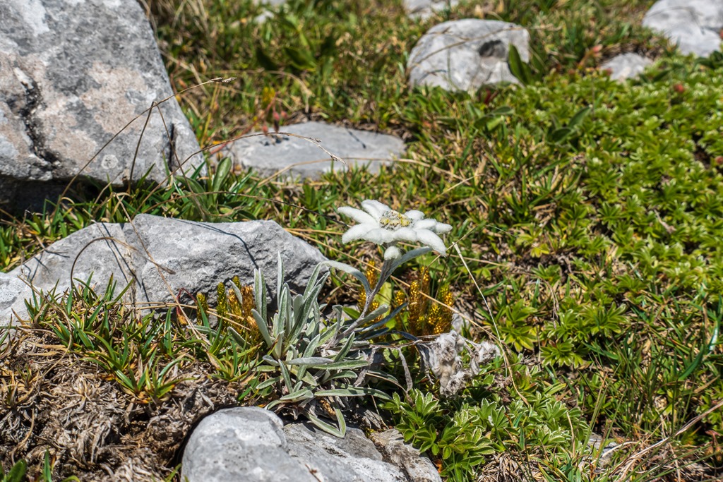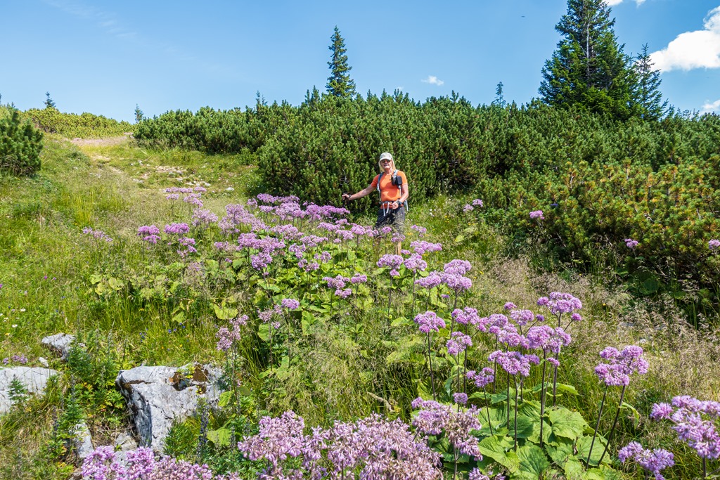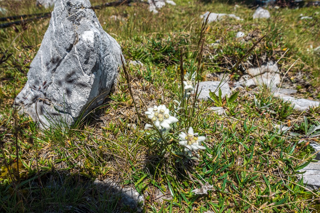 Mielőtt még bevennénk a Sacheibwaldhőhet, elköltjük máris jól megszolgált tizórainkat. 11:05-kor újra szedelődzünk és gyengéd emelkedők hátán érkezünk 11:55-kor a nagy kőhalommal jelzett csúcsra (fenti képek). Ezután irány a Seehütte. Képzetemben máris aranyló folyadékkal teli habos korsók kezdenek kísérteni, és tehát percnyi maradásom sincs. Útközben néhány tő csodaszép havasi gyopárra leszünk figyelmesek (lenti képek).