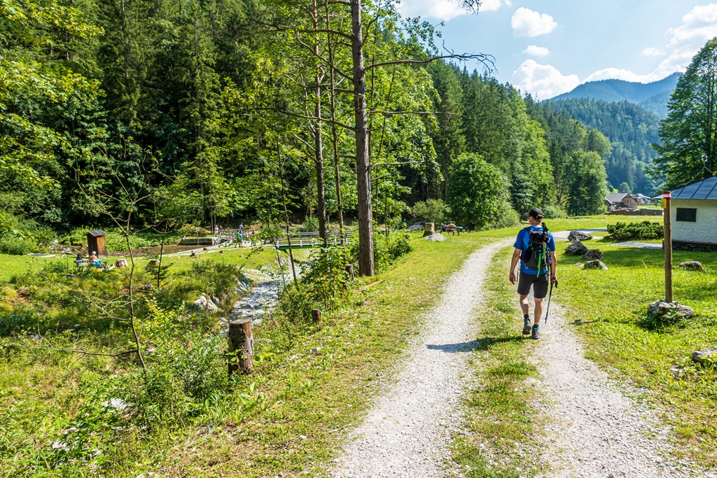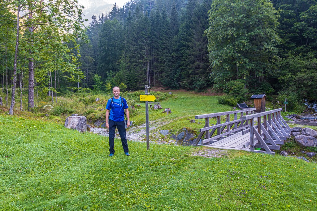 8:10 lehet, amikor a reggeli 13 C fokban, szinte még dideregve elindulunk az árnyékban lévő Äußere Knappengraben turistáknak szánt parkolójából. Átmasírozunk egy fahídon, mely a Sieben Quellen (Hét Forrás) táplálta patakon át vezet, és máris a Rudolfsteigen folytathatjuk. Árnyékos erdőben. Ez a Rudolfsteig természetesen nem összekeverendő a hasonnevű testvérével a Raxon.