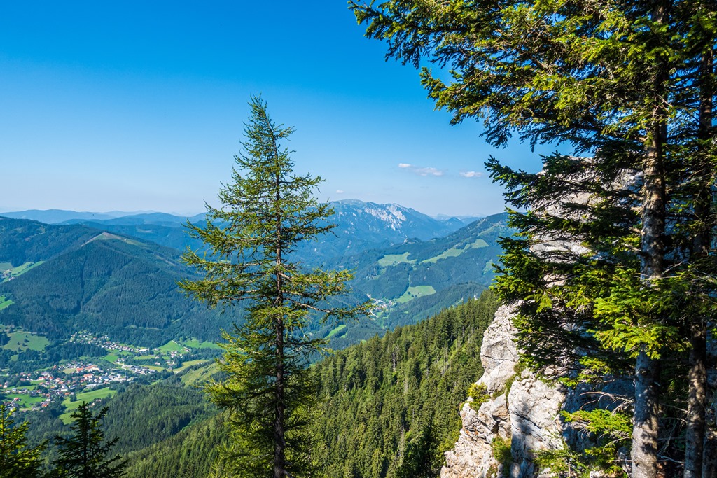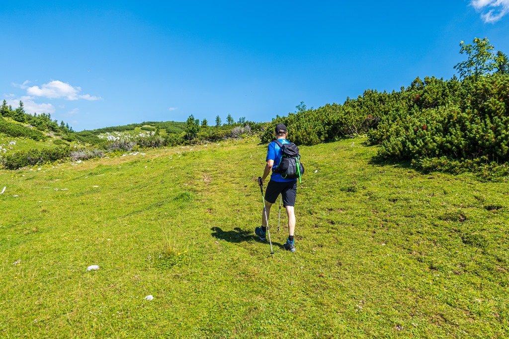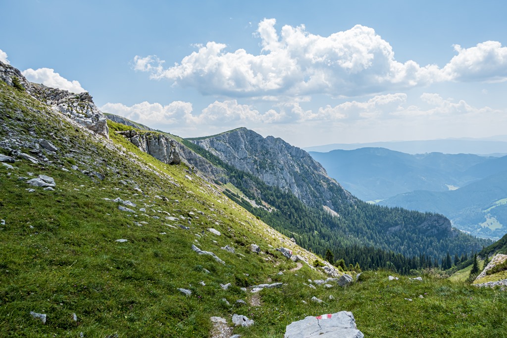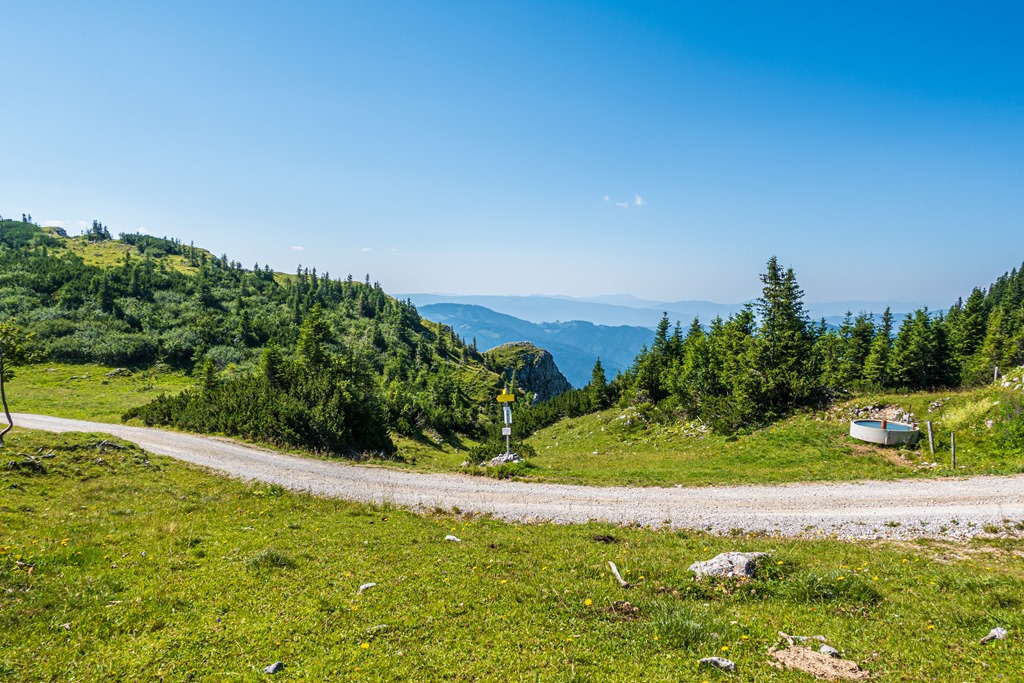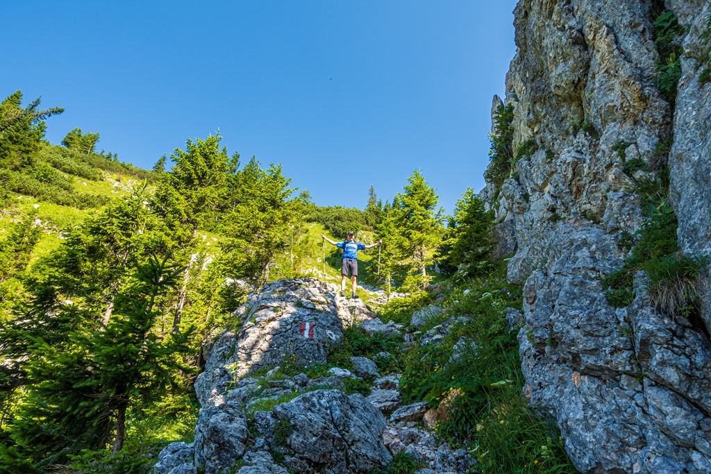 Mint kiderül, ez a turistaút az egyik leggyengédebb, azok között, melyek a Schneealpe platójára vezetnek. Hőségben, nagy előnye, hogy gyakorlatilag a kibukkanásig árnyékban visz. Csupán csak a legutolsó rövid szakasz sziklásodig nyersre (fenti kép), de még itt is árnyékod ad jobbkéz felől emelkedő sziklafal.