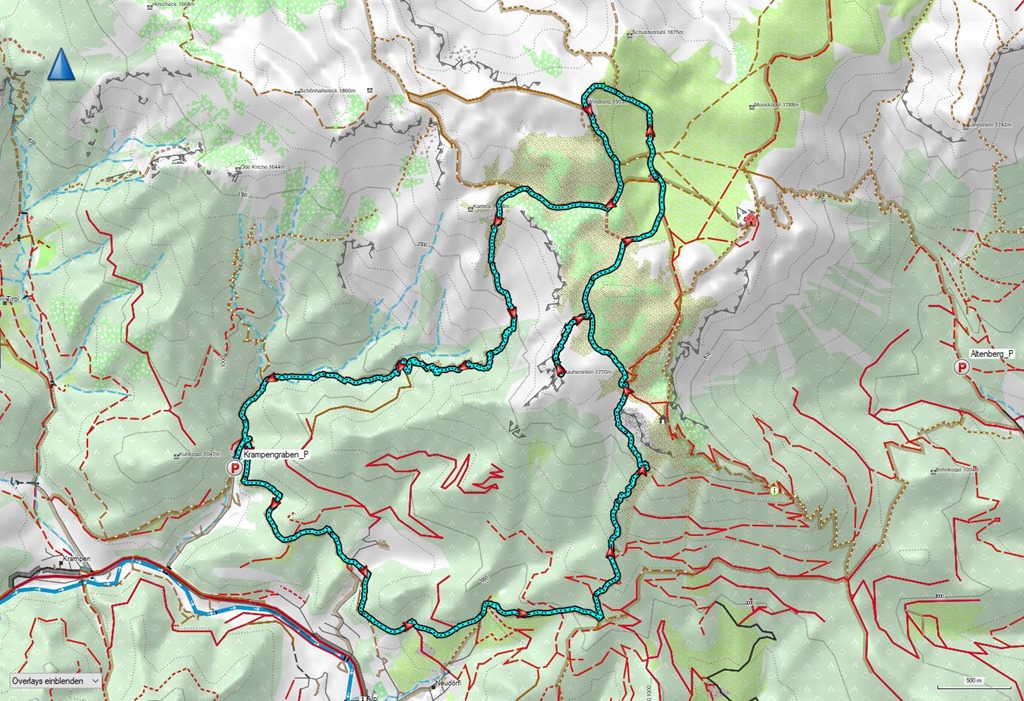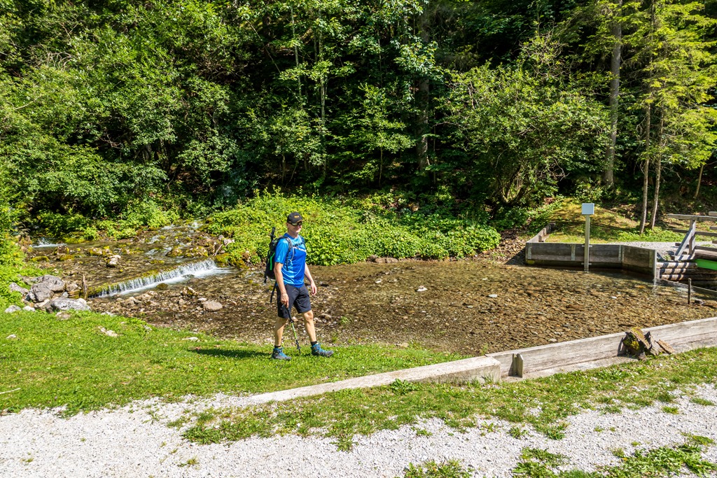 A hegy déli gerincén ereszkedünk le, majd a Brunnwiesen át (fenti kép) megkezdjük a végső ereszkedést, mely a Karlgraben mélyén vezet, ahol két, jéghideg tiszta vizű forrás is kínál lehetőséget a szomjoltásra.