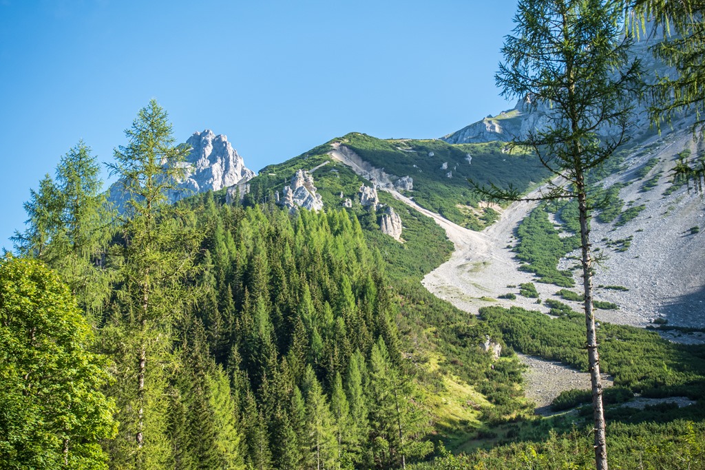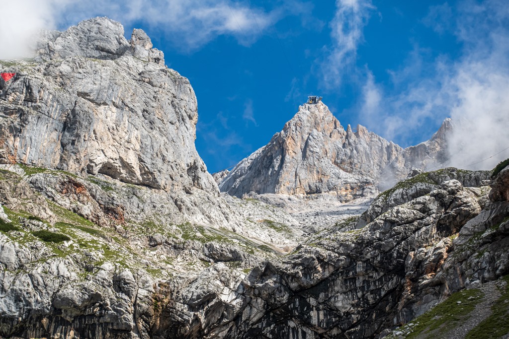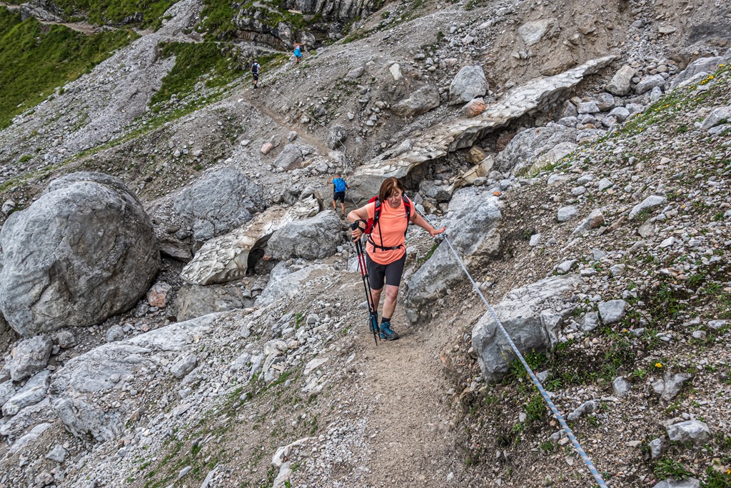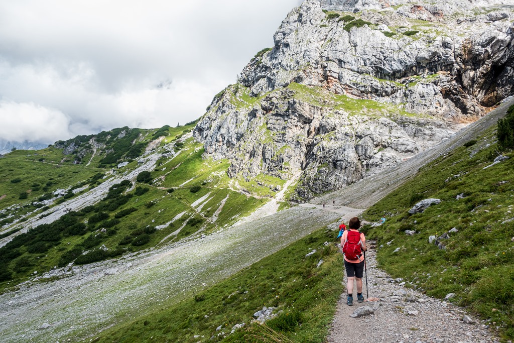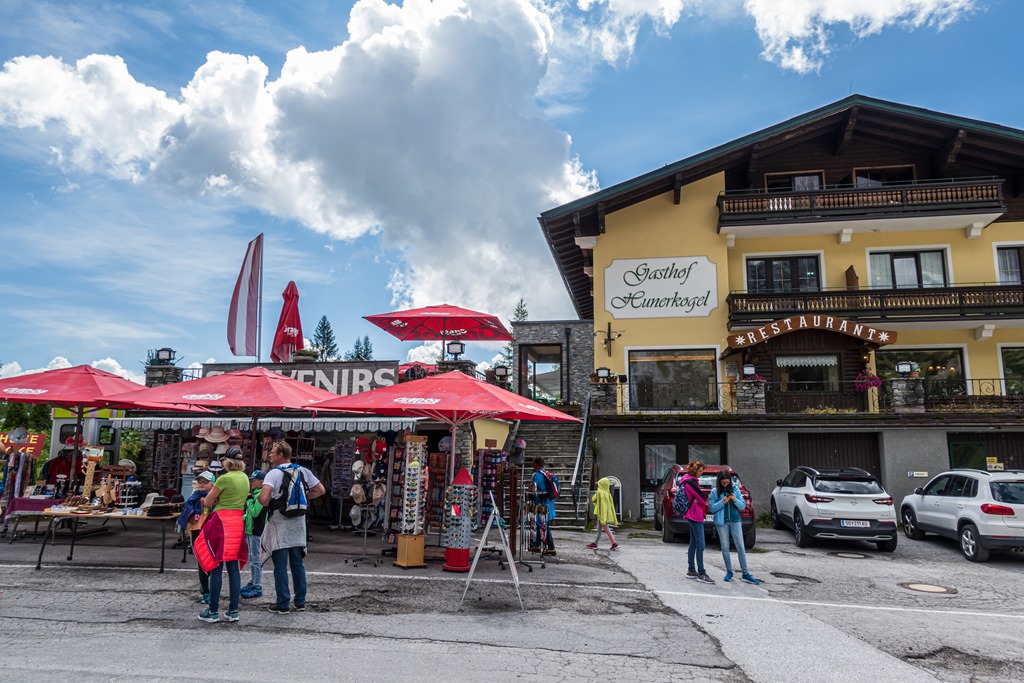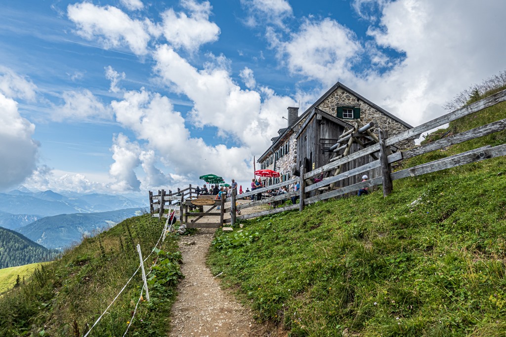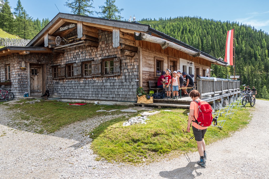 A Brandriedelröl leereszkedve az Austriahüttehez érkezünk (10:05), ahol elvileg van egy hegymászó-alpesi múzeum. Sajnos csak maszkban szabad bemenni, így inkább kihagyjuk. Folytatjuk tehát a Türlwandhütte felé, amit 10:35-kor érünk el (lenti képek).