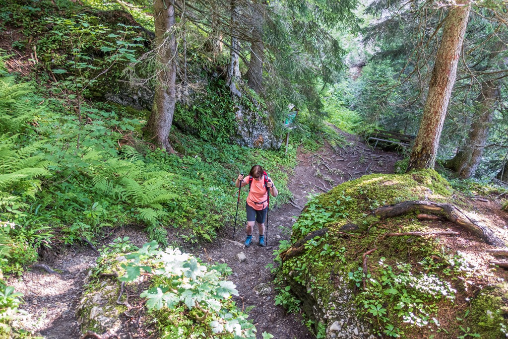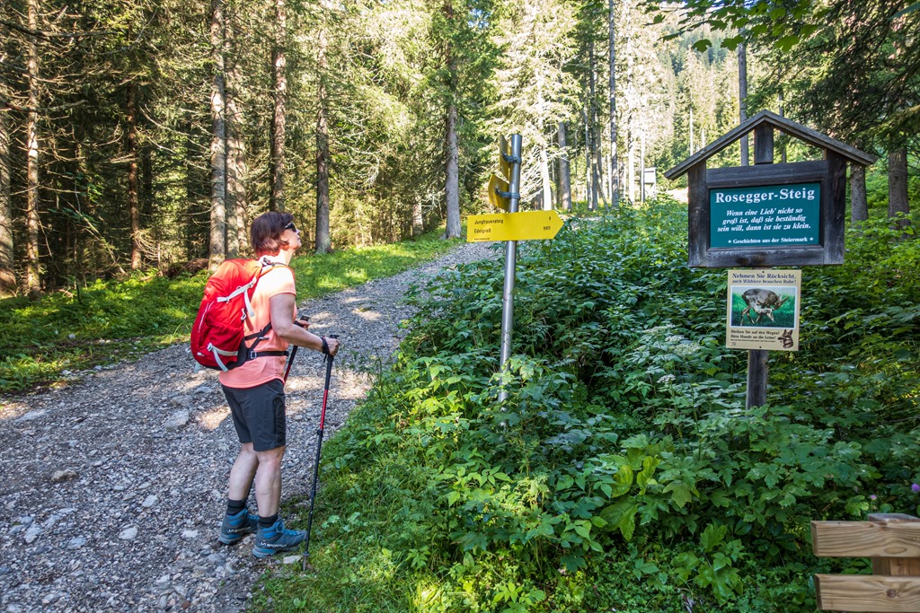 A Roseggersteig egy úgynevezett tipikus Wurzelsteig, azaz egy méretes gyökerekkel teli turistaút, helyenként ugyancsak meredekre sikeredett kaptatókkal megtűzdelve (lenti képek).