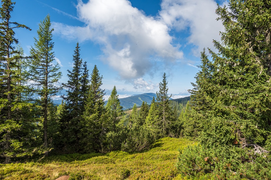 Az ösvény végében egy hosszú alumíniumlétra visz fel a Brandreidel gerincére (9:36 – fenti kép). Innen aztán egy könnyű kis turistaúton lehet elérni a szerény kis csúcsot (9:46), ami nem bővelkedik látványosságokban, tudniillik a kilátás a fenyvesek miatt eléggé korlátozott.