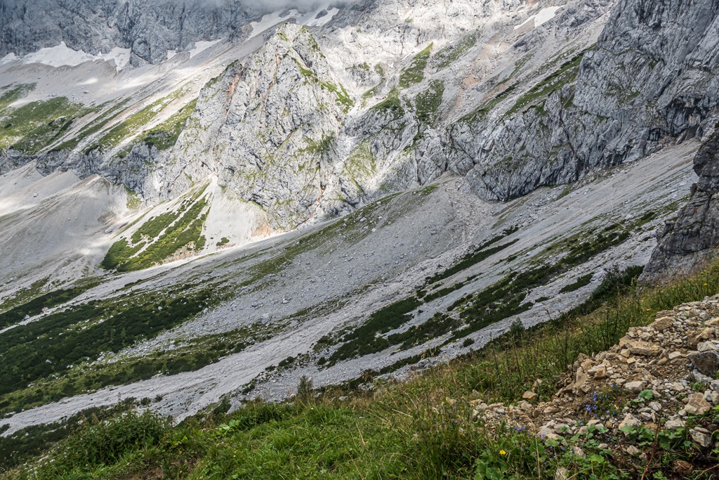 Következő célunk a híres Südwandhütte, mely számtalan kaland kiindulópontja. Többek között említsem meg az Anna és a Johann Klettersteigeket de a Pernerweget is meg kell említenem, mert azt fixre beterveztem egy soron következő alkalomra. Az út egyszerűen indul (lenti képek), de a kötélpálya alatt, ahol egy széles sziklagörgeteggel és jéggé fagyott hóval kitöltött árkon kell áthágni, szükséges némi plusz odafigyelés és ügyesség. Az út jellege innentől kezdve megváltozik, kifejezetten sziklás-alpesi. 11:20-kor érkezünk fel a Südwandhütte tövébe.