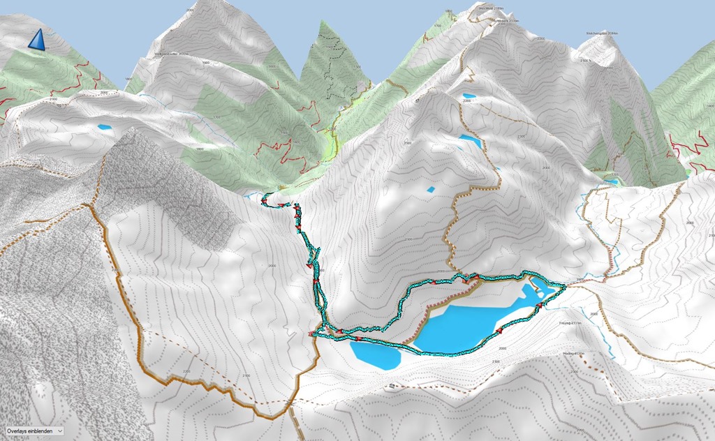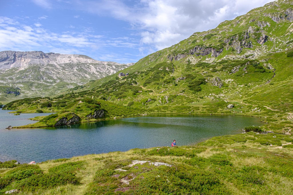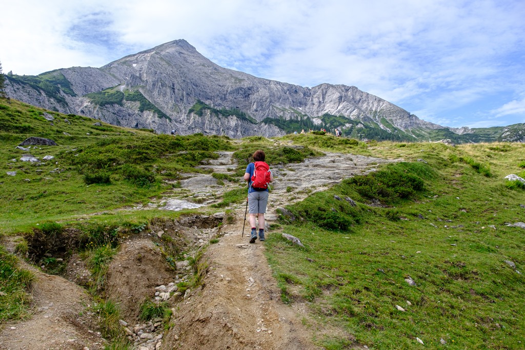 Az Ursprungalm egy seregnyi remek túra kiindulópontja, az egyik ilyen az alm fölé magasodó, és a vidék panorámáját meghatározó Sterische Kalkspitze (2459m) meghódítása (fenti képen). Mi most Angikával ilyen babérokra nem vágyunk, hanem inkább csak a tavak körbenjárásában vagyunk érdekeltek.
