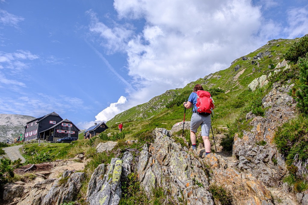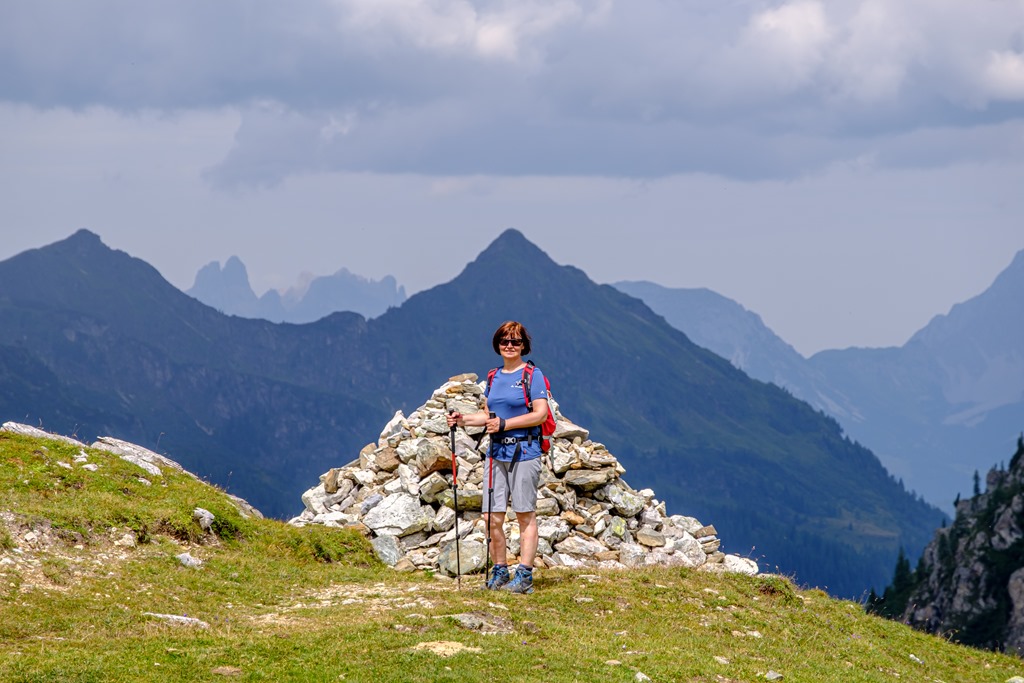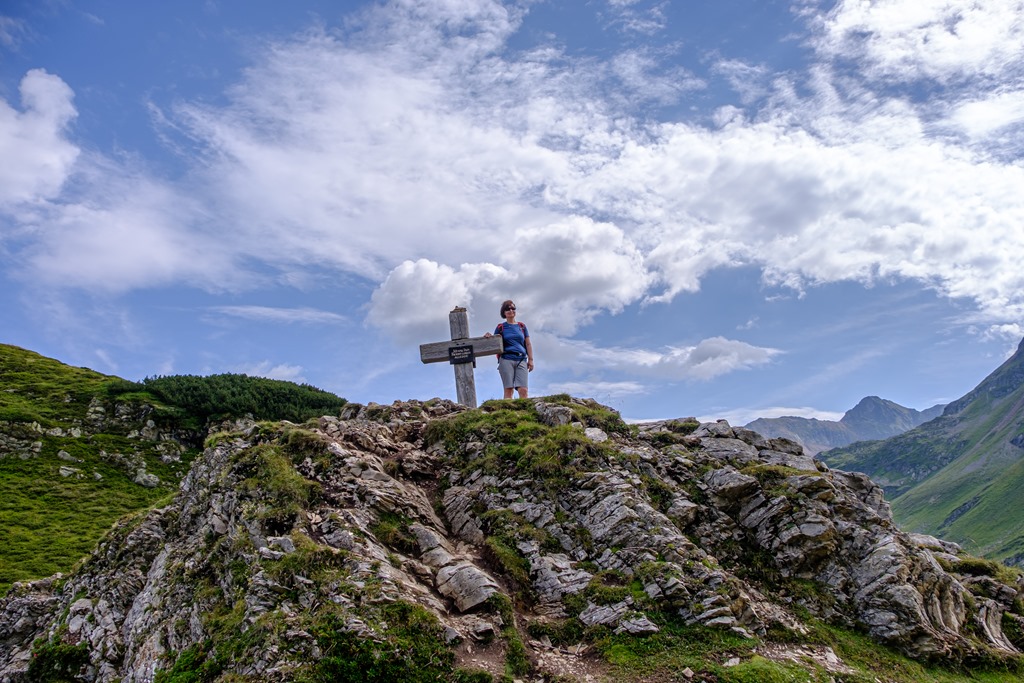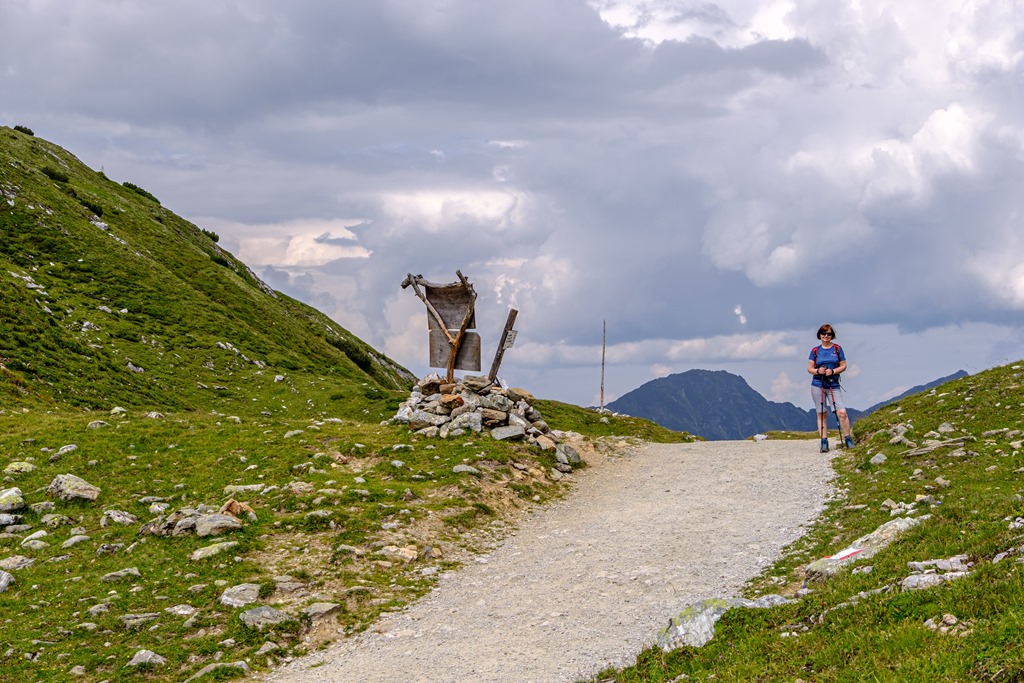 10:30-kor bukkanunk ki a Preuneggsattel nyeregben (fenti kép), ami mögött a tavak dominálta völgy terül el és megpillantjuk az Giglachseehüttet. Van itt egy csúcskereszt is, amit Angika mindjárt közelebbről is megtekint (lenti kép). Ezután még analizáljuk a kunyhó kínálta menüt, ami minden tekintetben kielégítené szerény igényeinket, de korai még az idő, de majd a visszafelé vezető út végén (amennyiben a másik, az Ignaz Mattis-Hütte nem nyerné el tetszésünket).