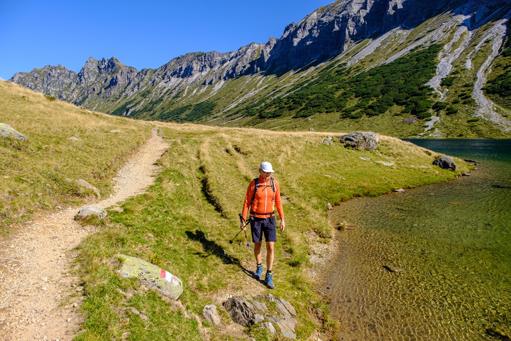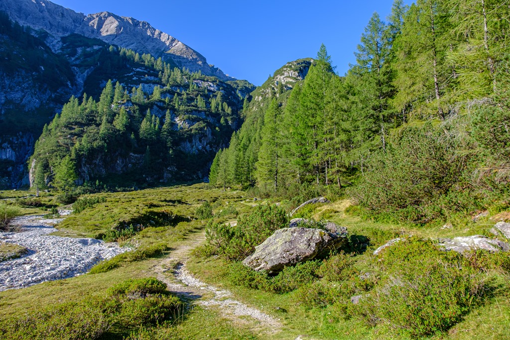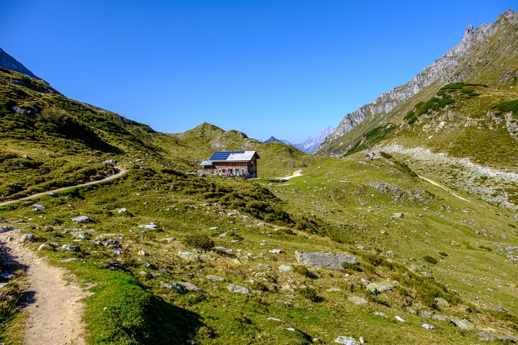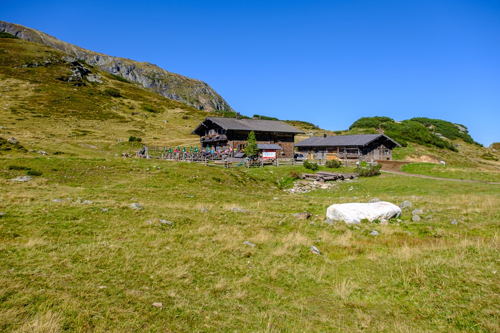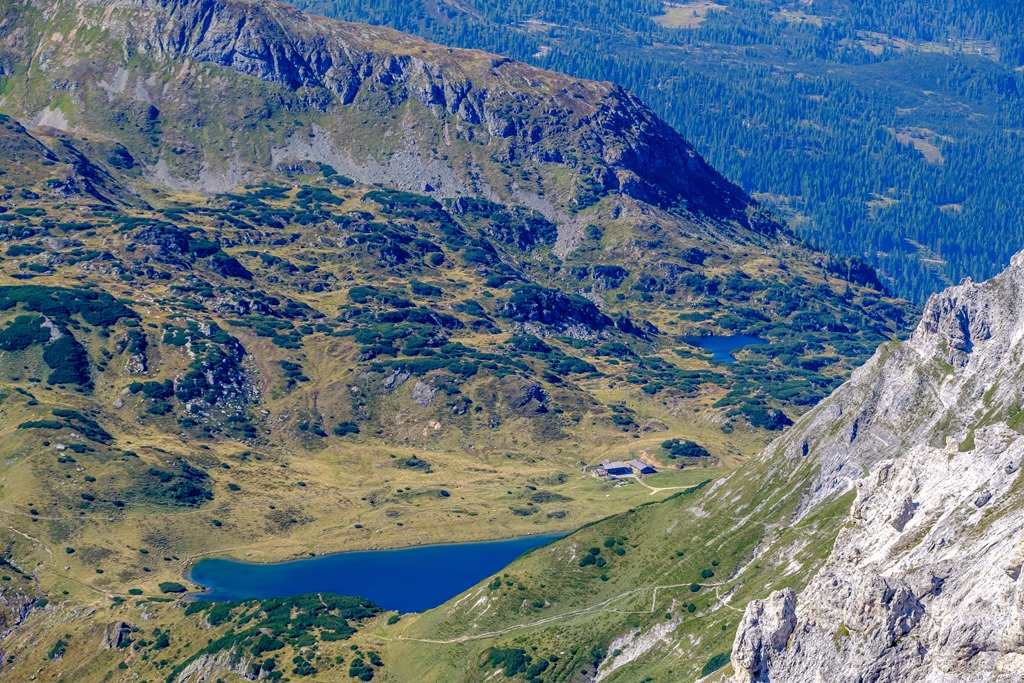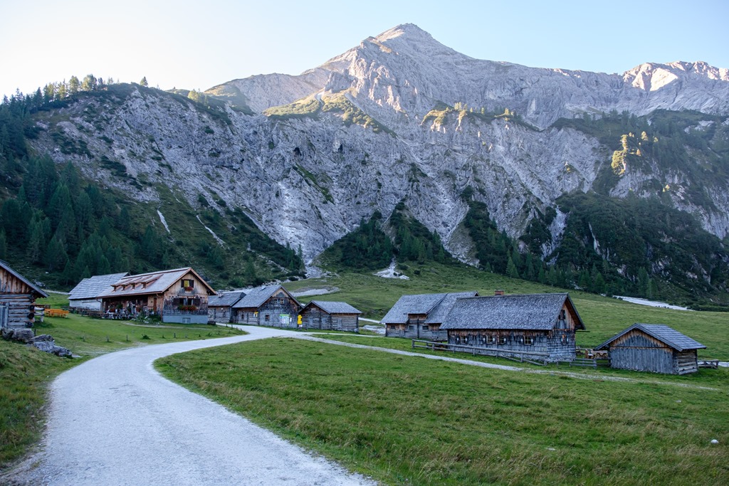 Az Ursprungalm még árnyékban szendereg (fenti kép, 9:00 óra), amikor nekivágunk, de az Alm feletti Stájer Mészköcsúcs már tündököl. Szerencsére hamarosan kiérünk egy napsütötte hegyhátra, mely a 2088 m szinten levő hágót, a Brotrinnlt célozza meg. Mögötte található ugyanis első köztes célunk, az Oberhüttensee a hozzátartozó Oberhüttevel.