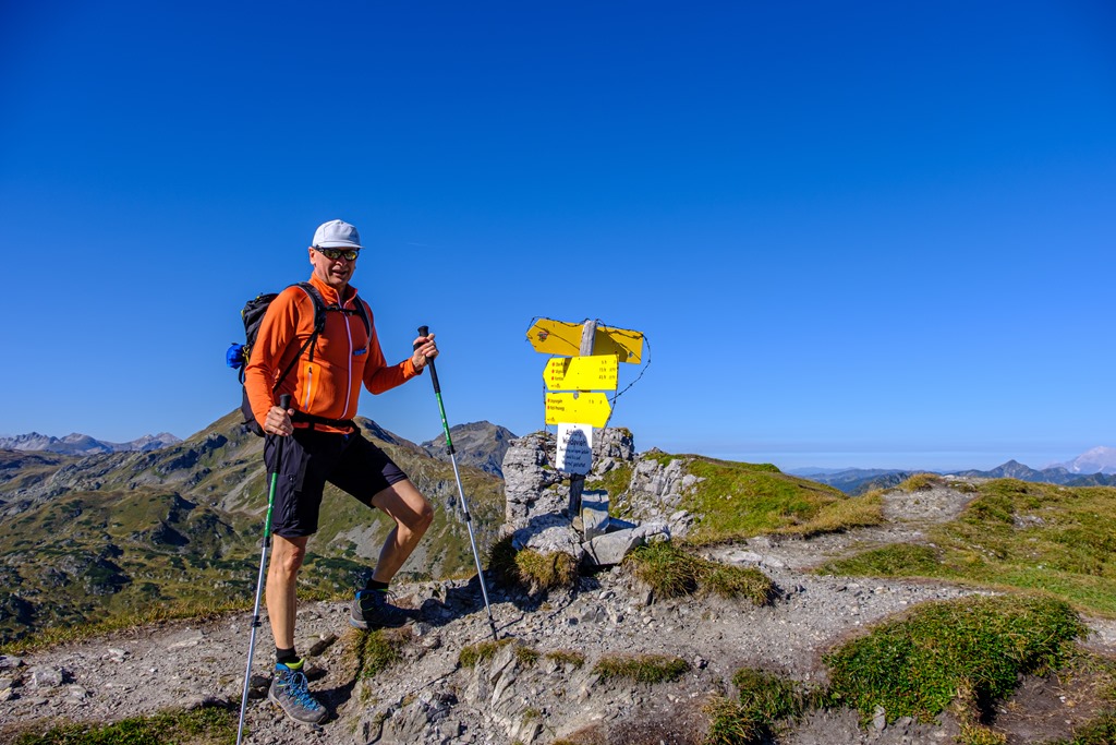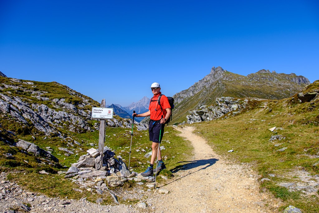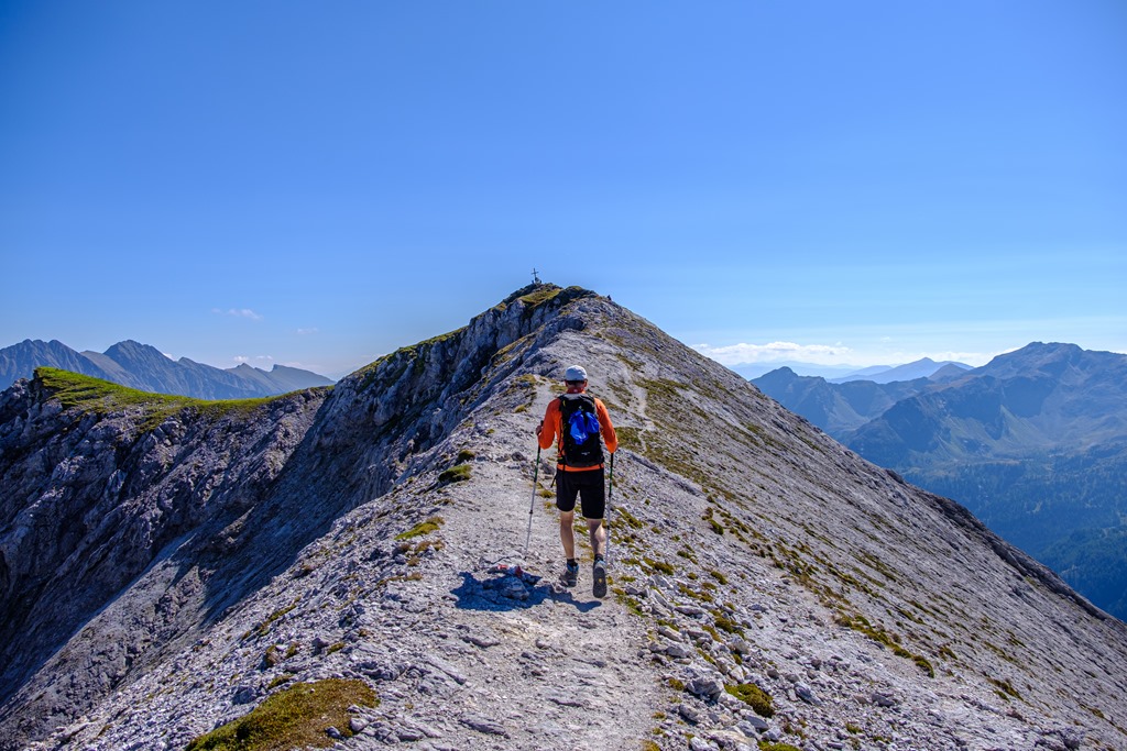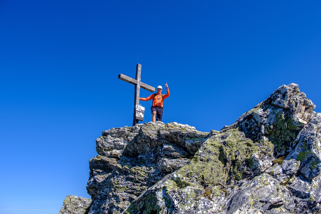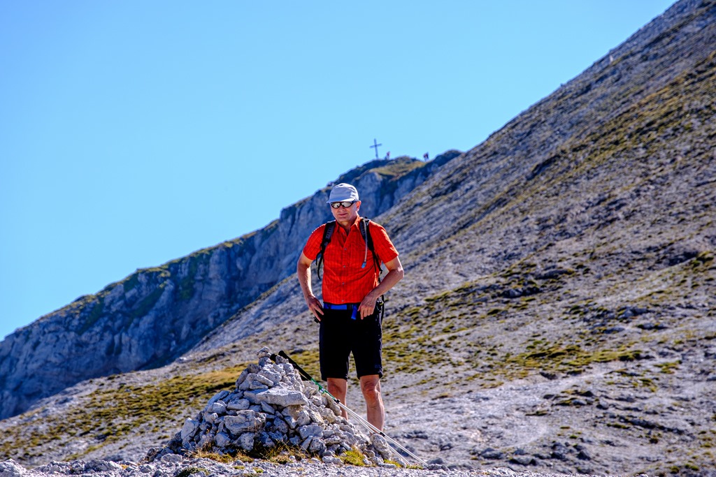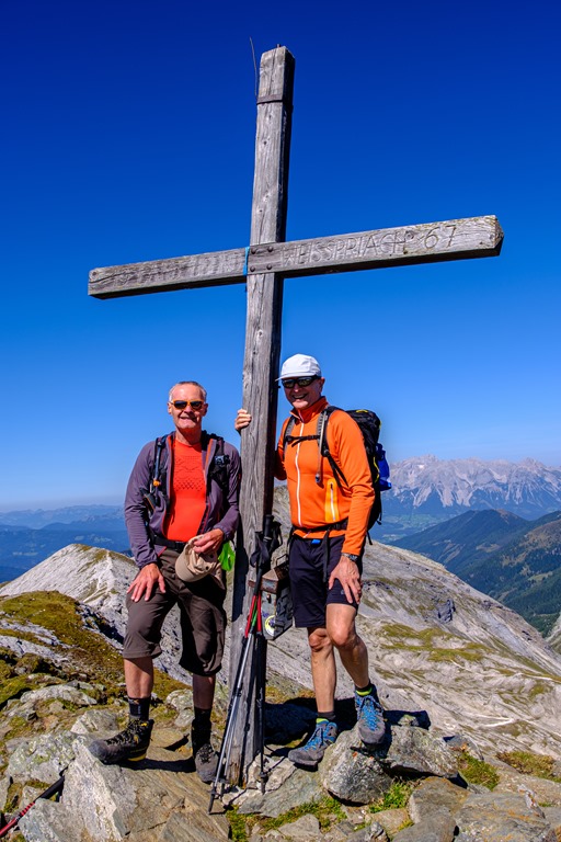 Nem is időzünk sokat odafenn, csak egy-két kép a „hőstettről” és aztán uzsgyi gyorsan lefelé. A nyeregben elfogyasztom varázsitalom (Chia ital) és utána indulunk a másik, a magasabb, de sokkal gyengédebb salzburgi csúcsra. Hely ugyan, a keskeny hegygerinc miatt az ottani keresztnél sincs túl sok, de lényegesen több mint a stájer kisöccsnél.