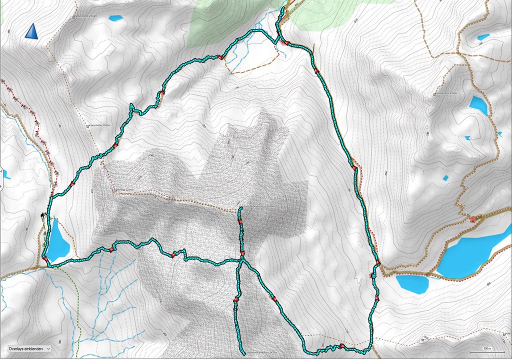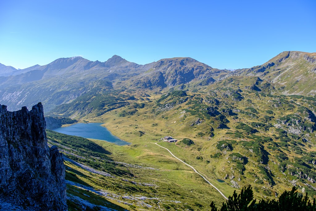 Pillantás a csúcsról az Oberseehütte felé (jól látható utunk csíkja is)