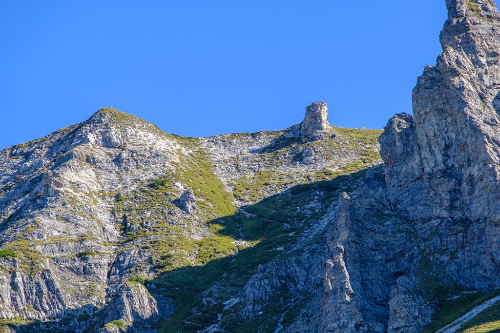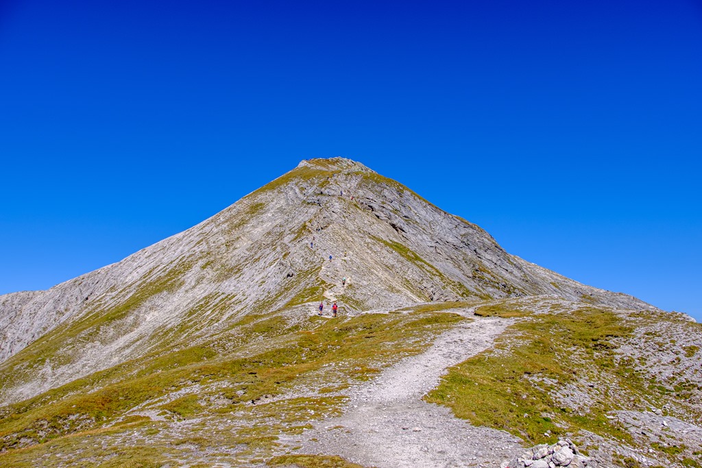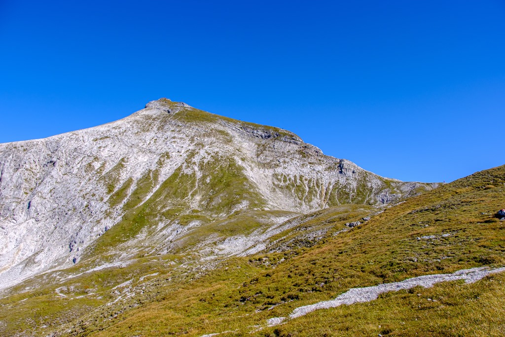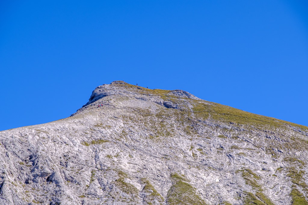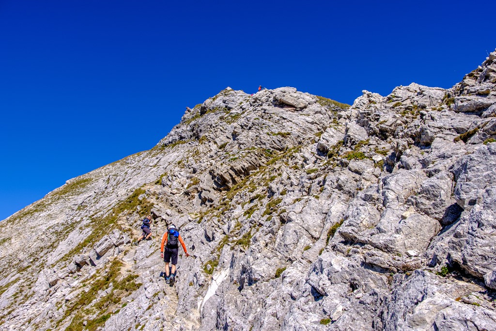 Nekilendülünk tehát az Akarscharte (nyereg, 2315m) felé emelkedő turistaútnak, mely azon túl, hogy derekasan visz egyre magasabbra, semmiféle különösebb meglepetéssel nem szolgál. Még a nyereg elérte előtt rálátni a Stájer Mészkőcsúcsra, illetve északi sziklás gerincére. A távolból szinte bevehetetlen akadálynak tűnik, aminek ellentmond a népek, jól megfigyelhető ide-oda történő tévelygései a hegyen. Van aki már lefelé araszolgat, mások meg éppen igyekeznek a csúcsra (lenti kép). Majd meglátjuk.