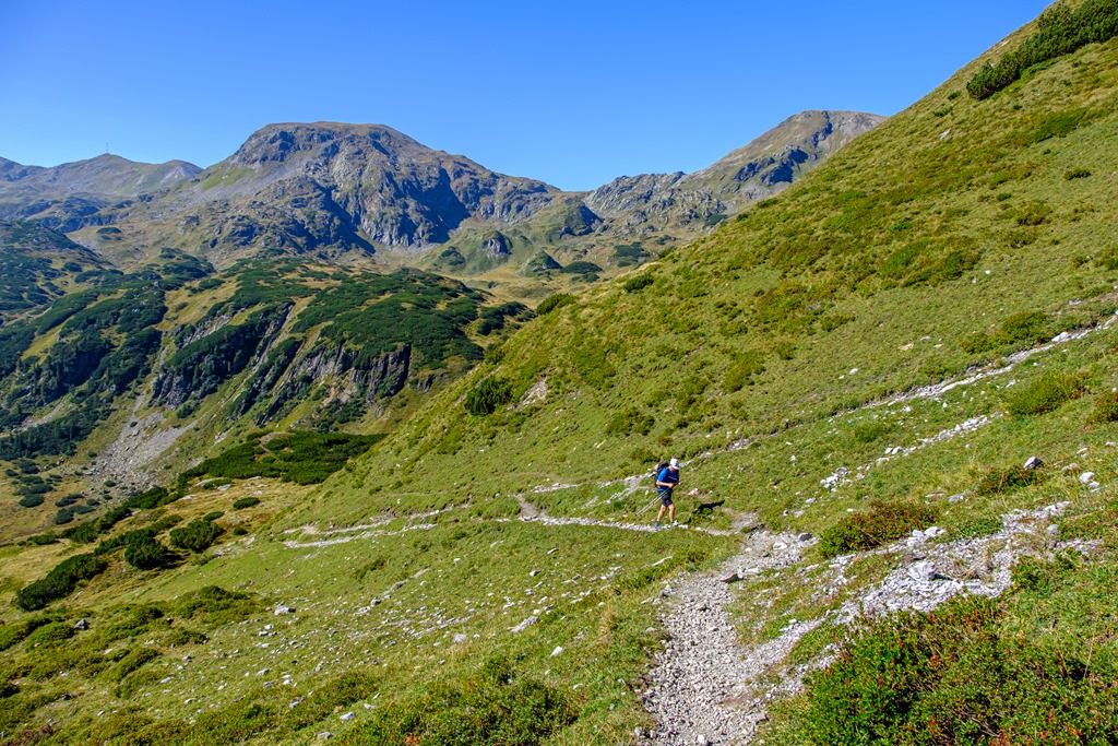 Nos, ha ennyien képesek megbirkózni a heggyel, akkor mi is elbánunk vele. A túrabotokat azért tanácsosnak látjuk összehajtogatni, hiszen nyilvánvalóan kezet kell majd emelni a sziklára. A mászás aztán nem jelent semmiféle nehézséget. Legfeljebb 1- szint, de a kitettség azért kissé emeli a kívánalmakat. Miután túljutottunk a sziklalépcsőn (melyet Péter mindjárt el is keresztelt Stájer Hillary lépcsőnek) szelídülnek a viszonyok, jól járható hegygerincen gyalogolhatunk tovább.