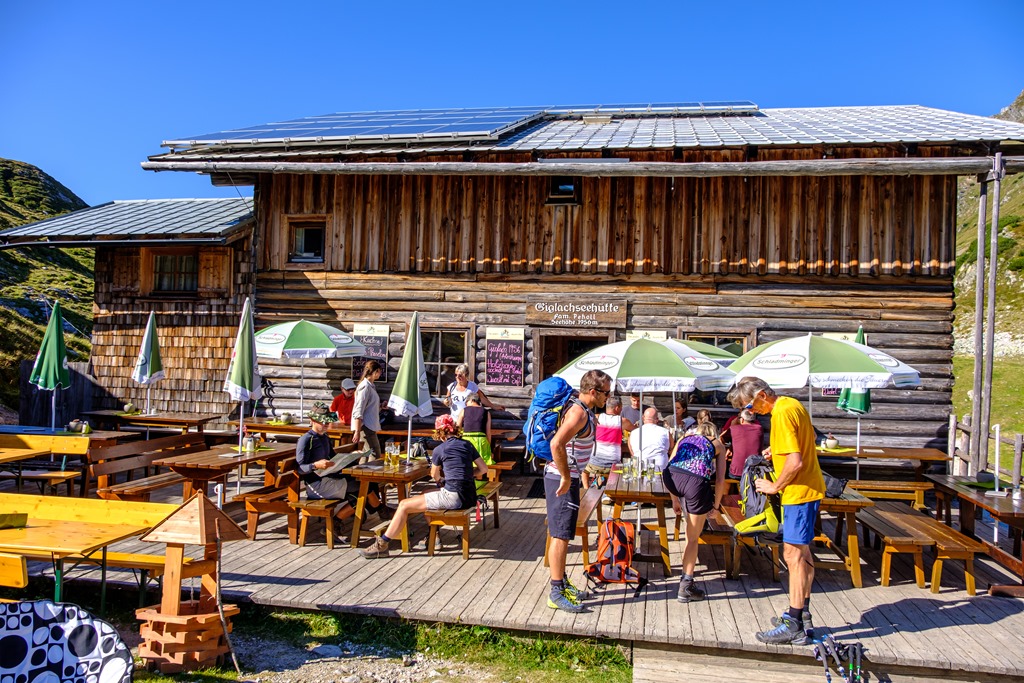 Jöhet tehát a kirándulás kellemes, befejező része. Leereszkedés a Giglachsee tavak szintjére, majd ebéd a Giglachseehütteben (fenti képek). El is nyújtjuk a pihenőt, hisz az Ursprungalmra vezető utat már ismerem, sem nem hosszú, sem pedig nem nehéz.