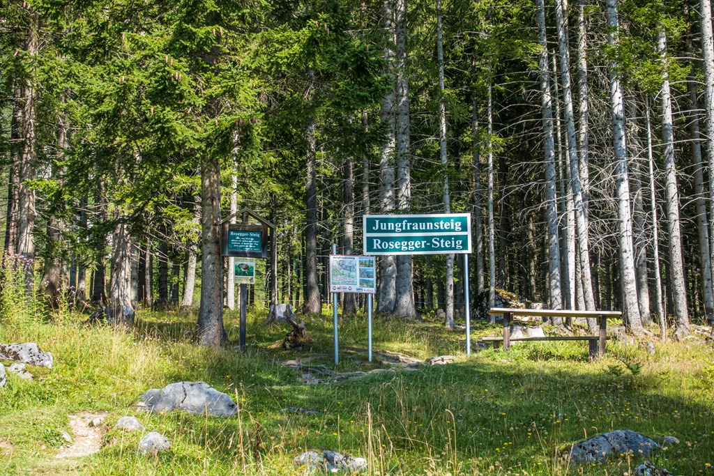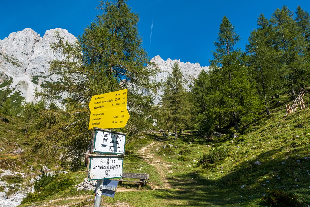 Ausztria legmagasabban fekvő postaládájához vezet a Szüzek ösvénye, azaz a Jungfrauensteig. És ez nem egy fiktív, szimbolikus postaláda, mint mondjuk ama Gippel tövében levő, hanem egy teljesen reguláris. Mindennap érkezik a postás, kiszedni belőle az üdvözleteket. A tél beállta elött aztán leszerelik, mert ha jön a hó, elérhetetlen. Nos, miután megérkezem Ramsauba, még a délután elég hosszú ahhoz, hogy becserkésszem ezt az utat.