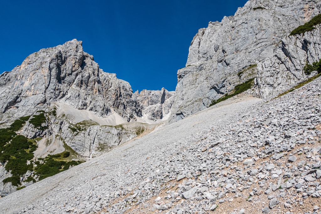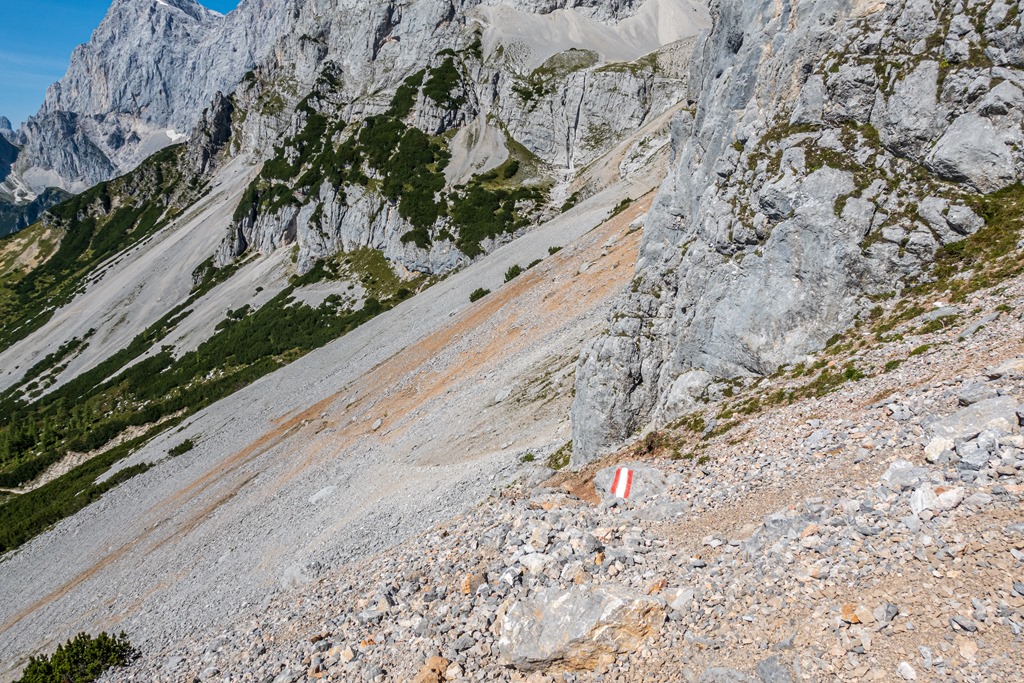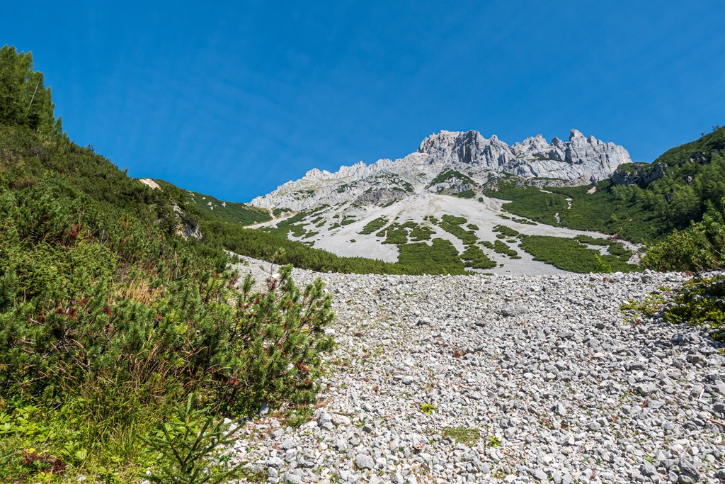 Utam egy széles sziklagörgeteg mentén halad (fenti kép), ami fölött szinte izzik a levegő. A hegyvilág dimenziói sugallják, hogy ez nem a jól ismert Breite Riess, hanem valami nagyobb tömegű domborzat. Az út fonala nem tekereg sokáig a görgeteg peremén, hanem nekibuzdul ama fent említett postaládához vezető, törpefenyőkkel benőtt gerincnek.