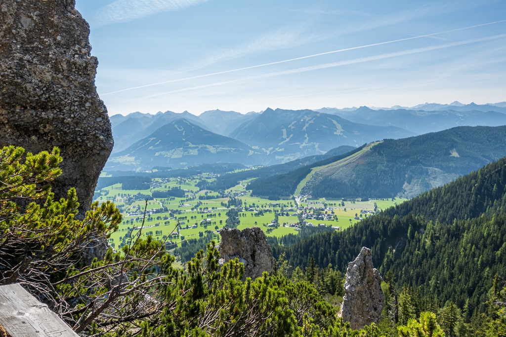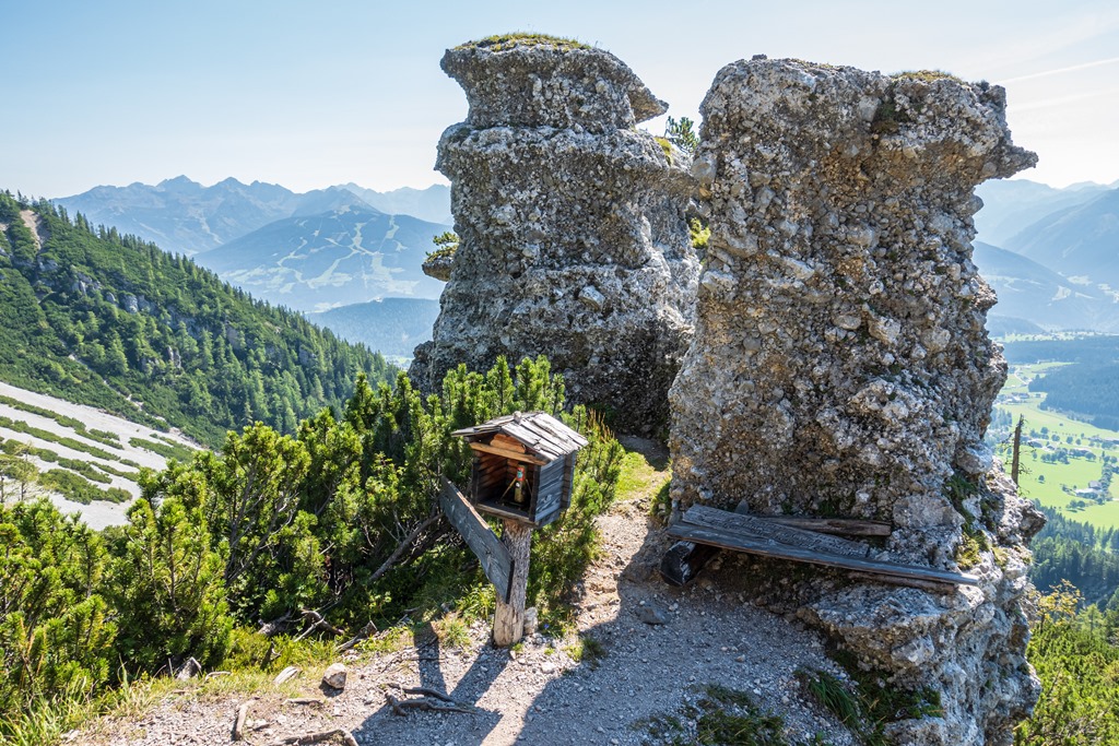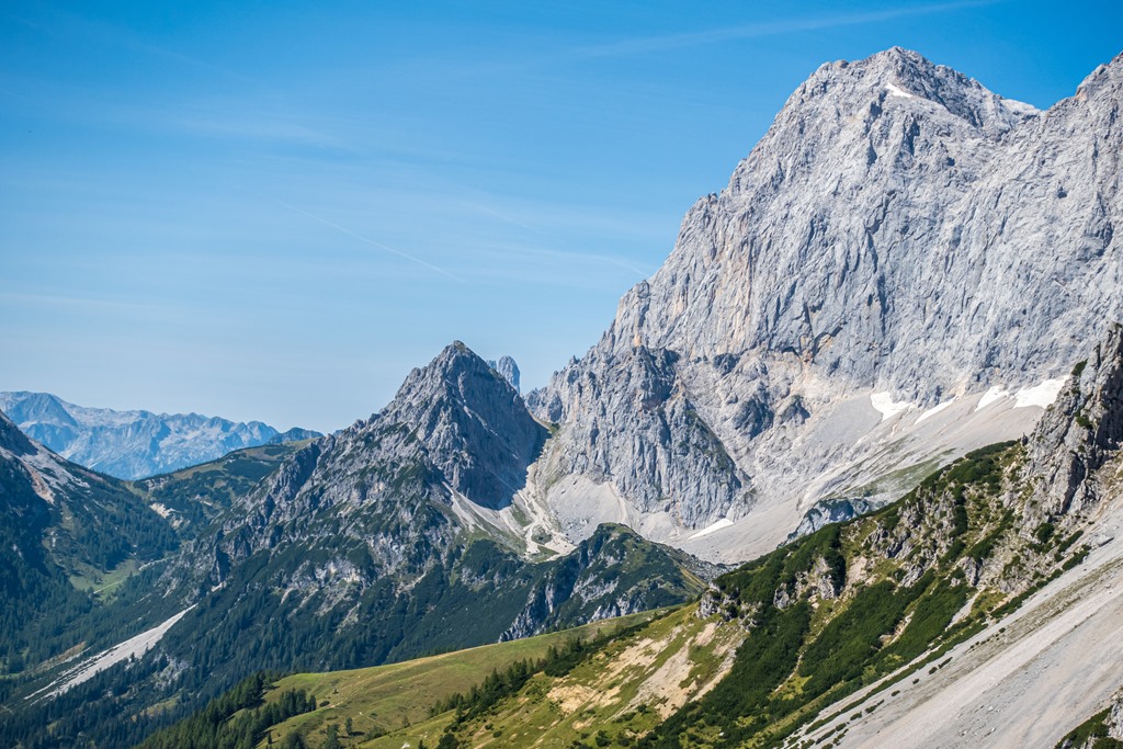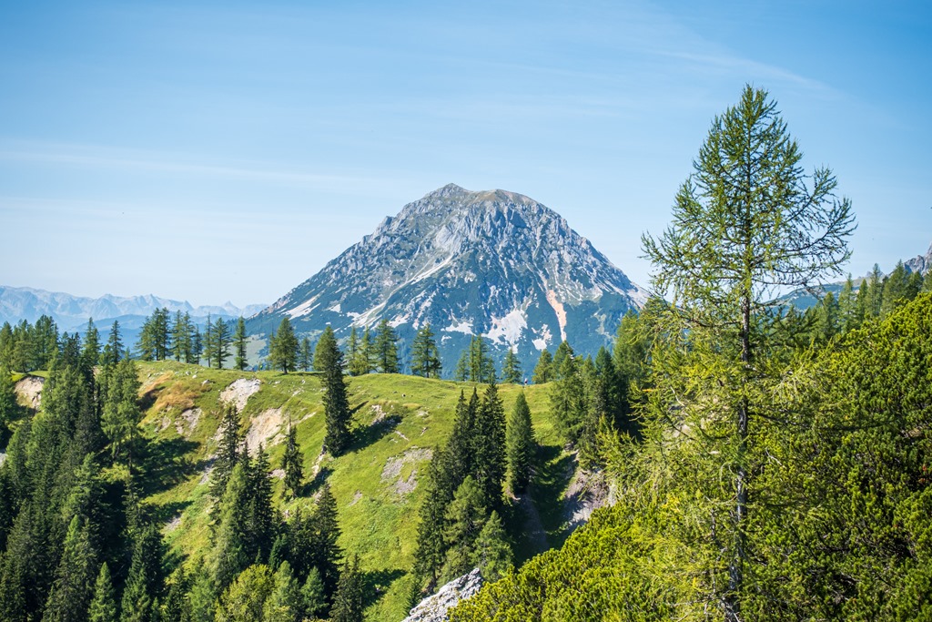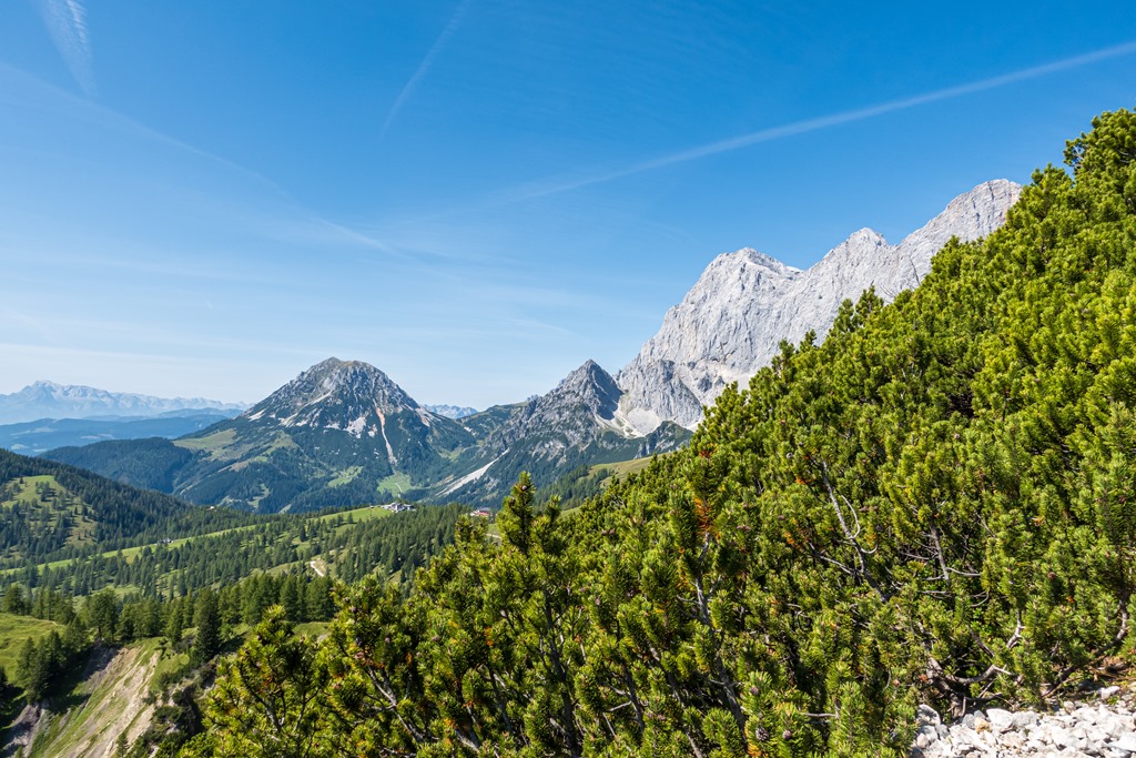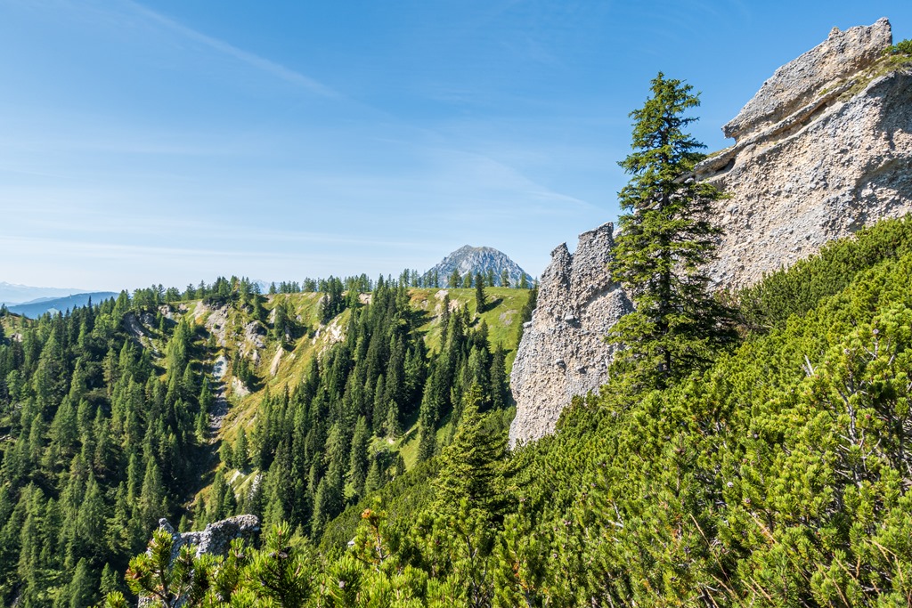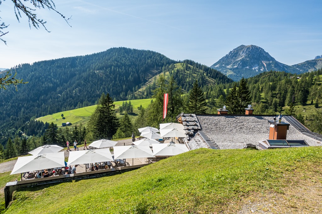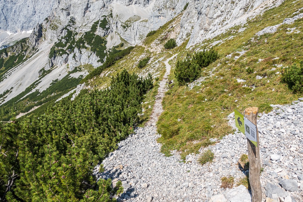 Ereszkedem rendre vissza a völgybe. A hegygerinc túlsó oldalán alászálló ág is a Jungrfauensteig névre hallgat. Először egy sziklagörgetegen küzdöm át magam, majd törpefenyők között vezet a kellemesebb út az Austriahütte felé. Egy leágazásban a Brandalm felé veszem az irányt, ahol pótlom mind az elégetett kalóriákat, mind pedig az elektrolitokat.