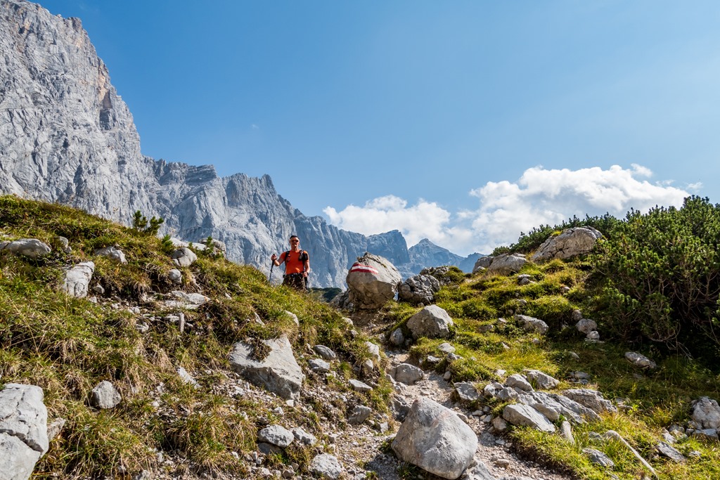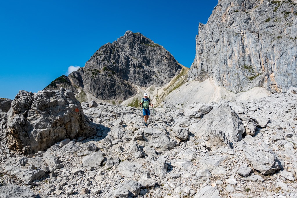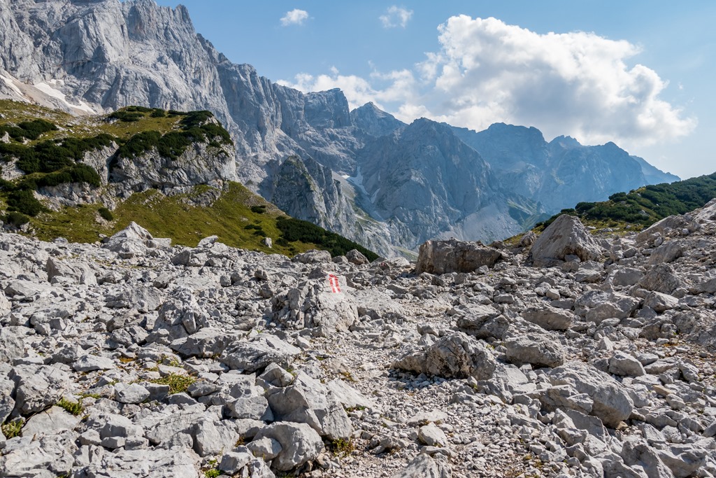 8:20 lehet amikor elindulunk a már korábbról megismert kaptatón. A különbség, hogy a Schaidlalm tövében most nem térünk le jobbra a széles erdészeti útról, hanem folytatjuk az emelkedőn a Rötelstein irányában, majd egy nagy ívben hajló jobbra tartó fordulóval begyalogolunk a sziklagörgeteggel borított Rauchkarba (9:45).