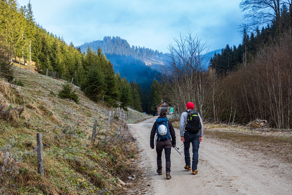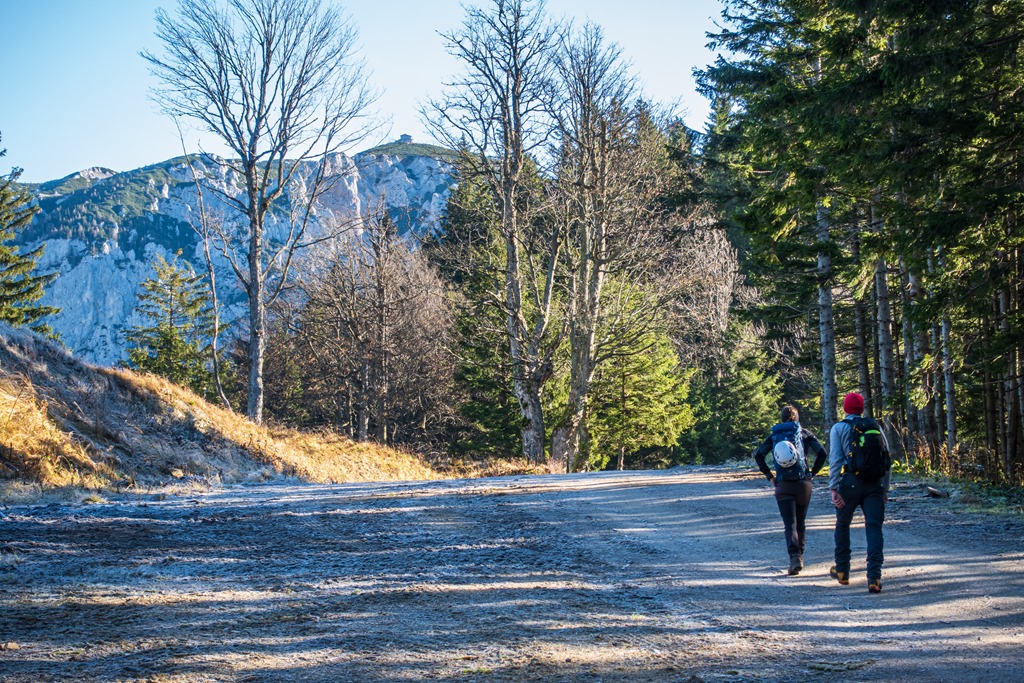 Mindössze egyetlen fokot mutat a hőmérő. Sűrű, szürke köd takarja az égboltot, de szerencsére szélcsend honol. Kesztyű, sapka gyorsan megtalálják a rendeltetésüket. A 442-es turistaút, mely az Altenbergbach patak medrét követi, az elején még aszfaltborítású. Ezen menetelünk északi irányba, a Naßkam hágó felé (fenti képen), mely egyik különlegessége, hogy a Schneealpet és a Raxot köti össze. Cirka egy órás séta után érkezünk a völgy végében levő, immár színültig telt parkolóhoz. Itt megszabadulunk egy-egy réteg ruházattól, mert következnek a rendes, verejtéket fakasztó kaptatók.
