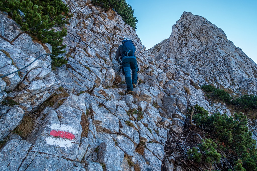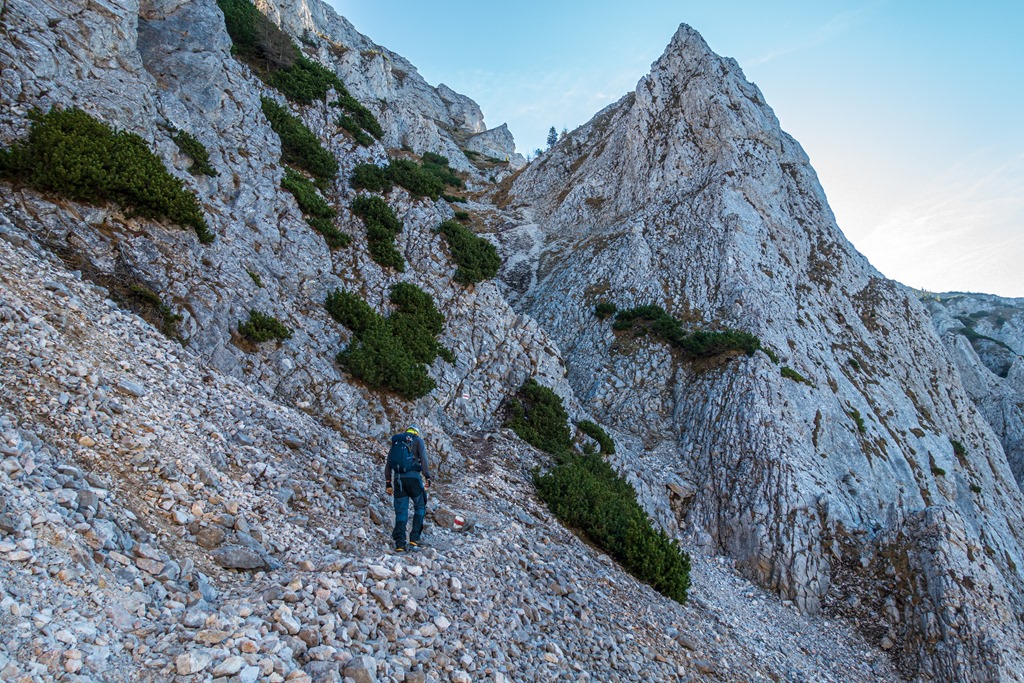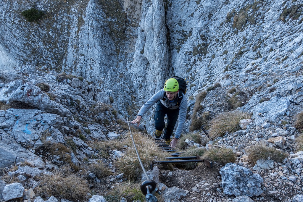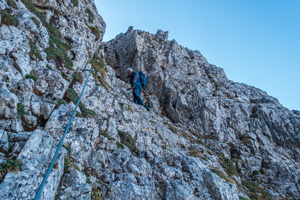 Oda-vissza mindössze 20-25 perc extra idő-igénnyel jár. Visszaereszkedünk a nyeregbe és jöhet a fő attrakció, a szelíd zerge. Vad sziklavilágon visz a viszonylag alacsony technikai nehézségeket támasztó ösvény, legfeljebb 1-es szinten illetve A/B kategóriás ferratán mászunk. Természetesen túrabotok nélkül, hisz itt a kéznek is akad dolga rendesen. Kantár kezdőknek és gyerekeknek ajánlott, sisak és kesztyű viszont mindenkinek. Ahogy az útvonal neve is utal rá, odafenn zergék tanyáznak, és serényen gondoskodnak róla, hogy itt-ott kisebb-nagyobb kőtörmelékek hulljanak alá birodalmukból.