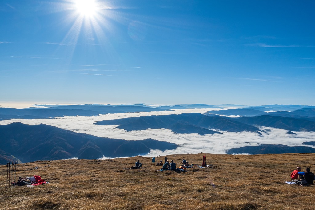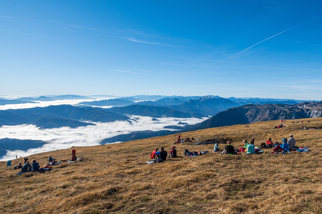 12:00 óra után lyukadunk ki a Heukuppe platója tövébe, majd még a csúcsot is bevesszük. Odafenn megérkezve, csodálkozunk is rendesen, még soha ennyi látogatót nem láttunk. Családok, kisebb-nagyobb csoportok szerteszét az őszi füvön élvezik a nap melengető sugarait. Feltehetően mindenki készül a jövő héten esedékes áldatlan lezárásra. Az emberek még kihasználja a természet adta lelki és fizikai erőt feltöltődni ahhoz, ami most még sajnos jönni fog.