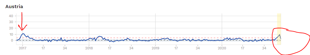És a 47. hét adatai alapján sincs túlhalálozás Magyarországon. Végre tudomásul kéne venni. Ausztriában a 46. héten volt egy figyelemre érdemes csúcs (9,09), ami viszont nem érte el a szélesebb és lassabban lecsengő 2017-es influenzajárvány szintjét (10,73 ahol a piros nyíl). Ez a hullám tehát máris tetőzött és most csökkenőben van.
