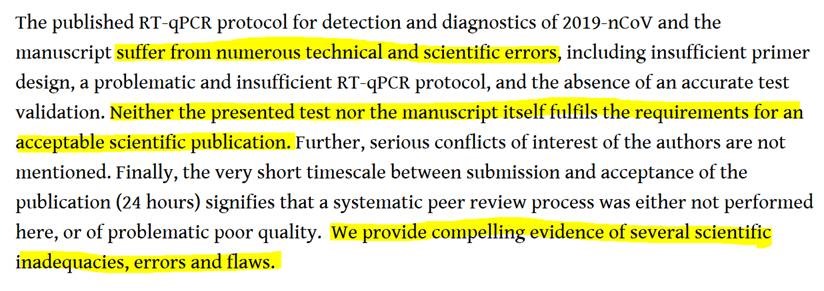 A fenti sárga kiemelés szabd fordítása: Tekintettel a PCR-protokollban található legkülönfélébb hibák miatt az a véleményünk, hogy az írás durván sérti a tudományos integritás alapjait és vét a tudományos felelősség ellen.