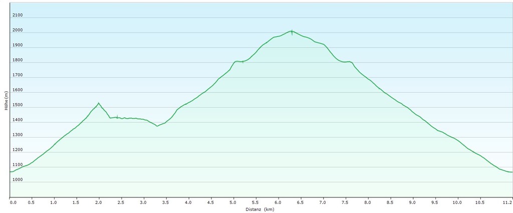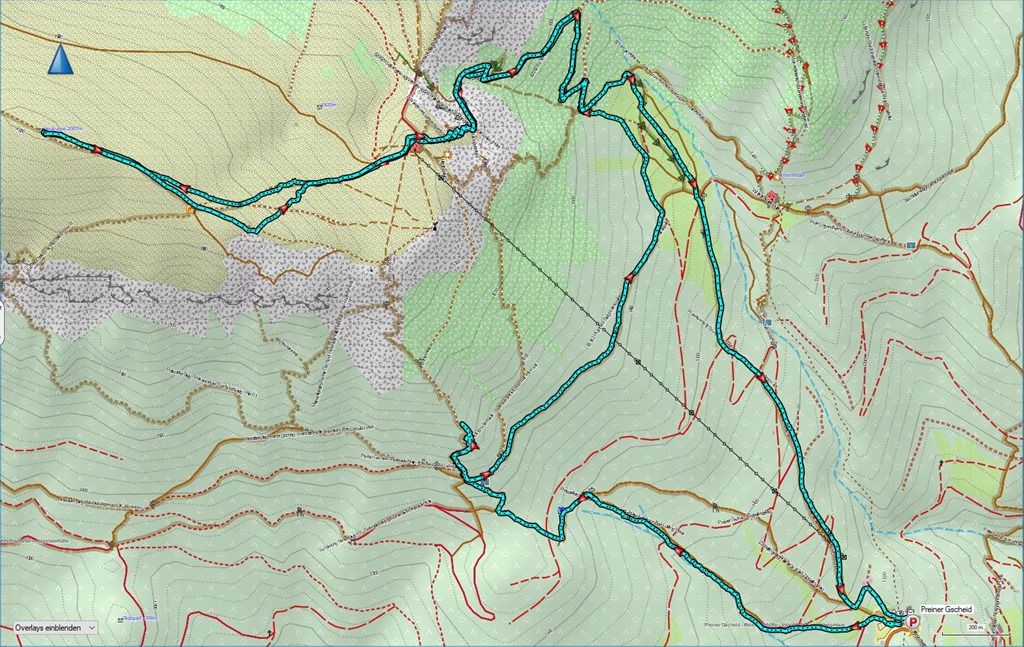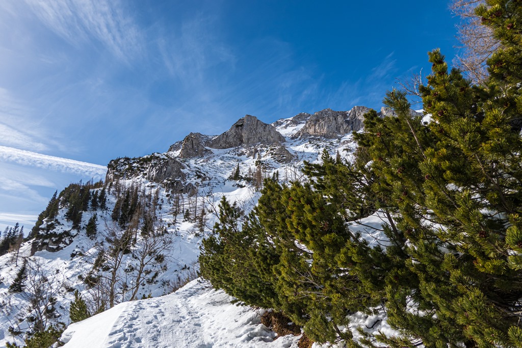 A napsütötte, felhevült katlanban kanyargó Schlangenwegen küzdjük egyre feljebb magunkat. Nem számítottam ilyen tavaszi melegre, és tehát kis gondban vagyok, kitart-e az ivó-készletem, ezért csak apró adagokban, óvatosan kortyolgatok. 12:30-ra érkezünk a Karl Ludwig-Haus tövébe, majd folytatjuk fel a bérc tetejére (13:10; lenti kép).