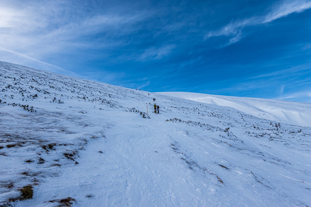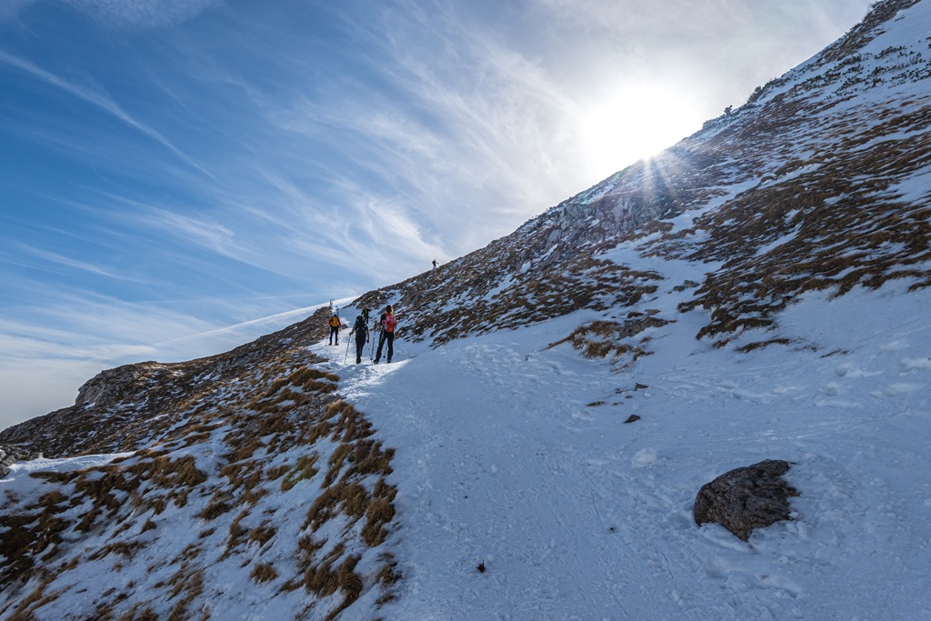Felfigyelünk néhány felkészületlen túra-kandidátusra, akik hágóvas vagy/és hótalp segédlete hiányában hajmeresztően billegnek, csúsznak amint óvatoskodnak lefelé. Rengetegen vannak ma a hegyen. A parkoló túlcsordult a hágón.