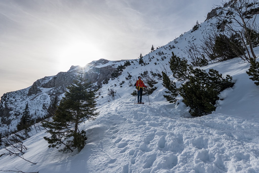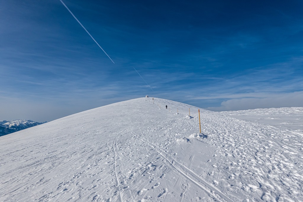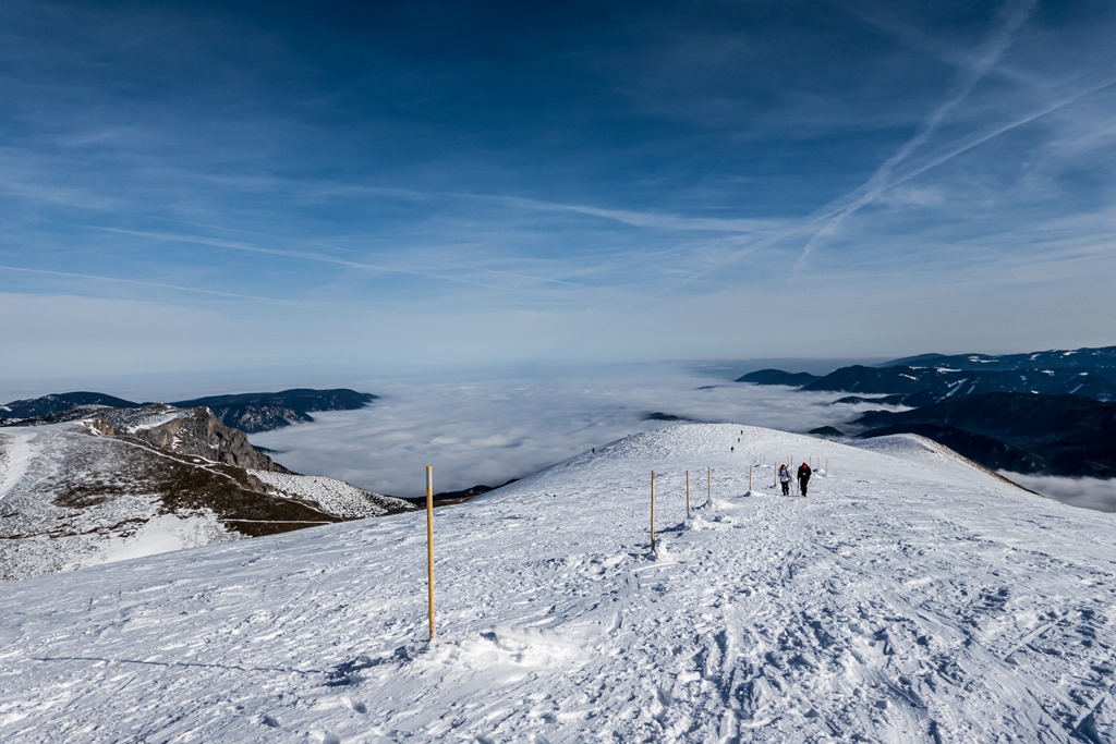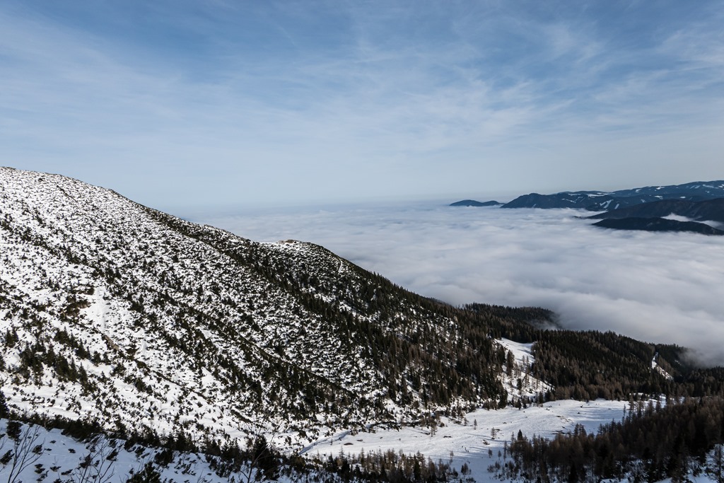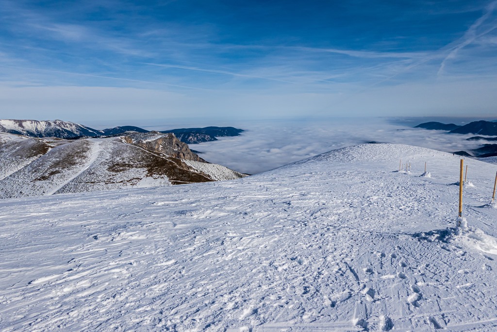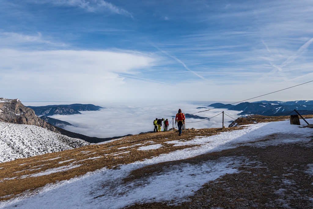 Ma mintegy 1000-1200 m szintig borítja majd köd a vidéket. Feljebb kell tehát orientálódni. Bizonyára megteszi majd a Heukuppe, hisz bőven eléri a 2000 métert is. Péter javaslatára a Gretchensteiggel próbálkozunk, de rossz érzésem támad a rengeteg hó láttán és inkább az alternatív B variáns mentén folytatjuk a csúcsostromot.