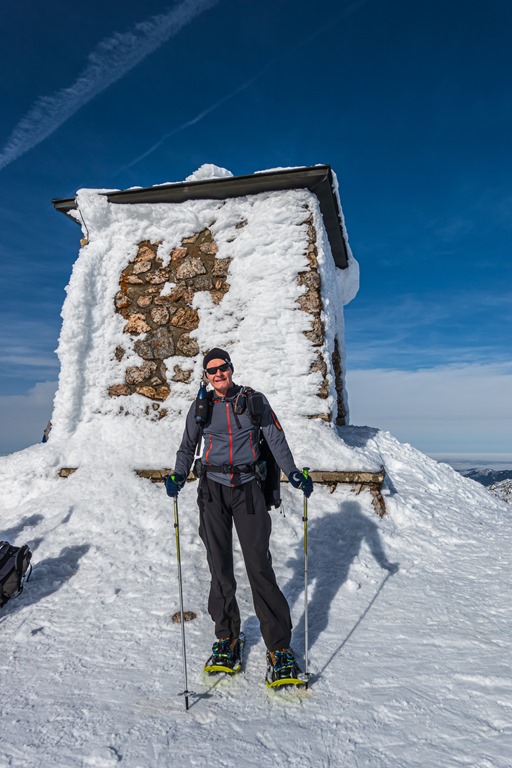 Odafenn (fenti és lenti képek) gyenge a légmozgás, ragyog a nap, elképzelni is nehéz lenne szebb téli időt. Nem is sietünk. Nyugodtan átöltözünk. Átizzadt gönceinket szárazra váltjuk, majd elmajszoljuk magunkkal hozott elemózsiánkat is. Jöhet a dolog könnyebb része, az alászállás.