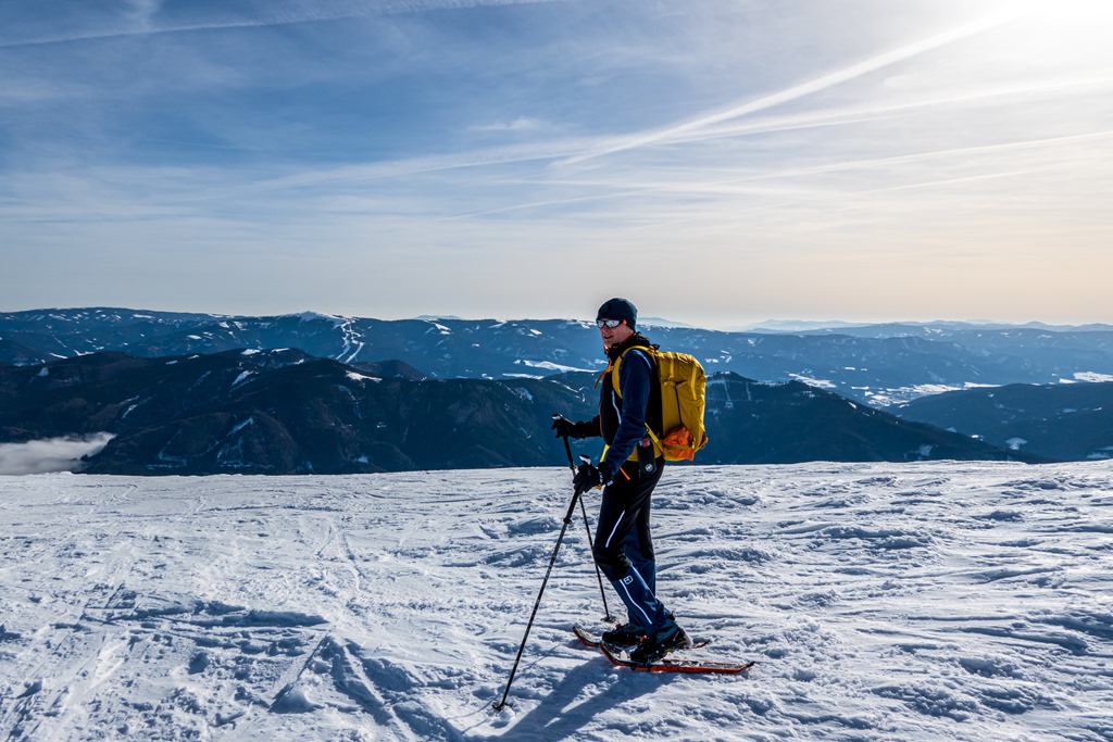 A hó kérges, fagyott állagú, a hótalpaknak mind felfele, mind pedig lefele jó hasznát vesszük. Gondoltuk, még meglessük a Gretchensteig kiszállóját. Abból tán meg lehet majd saccolni, járható-e. Legnagyobb jókedvünkre épp egy párosba botlunk, akik pont ezen az úton érkeztek, és tehát nyilvánvaló, hogy az út bejárható. Persze nem tudni, kik voltak ők, nem volt a homlokukra írva, hogy csak közönséges emberi halandók, avagy Mt. Blancot is megjárt tapasztalt rókák.