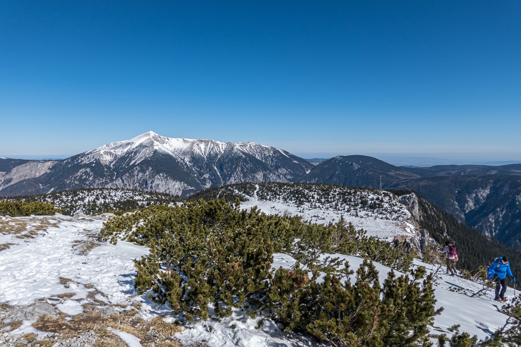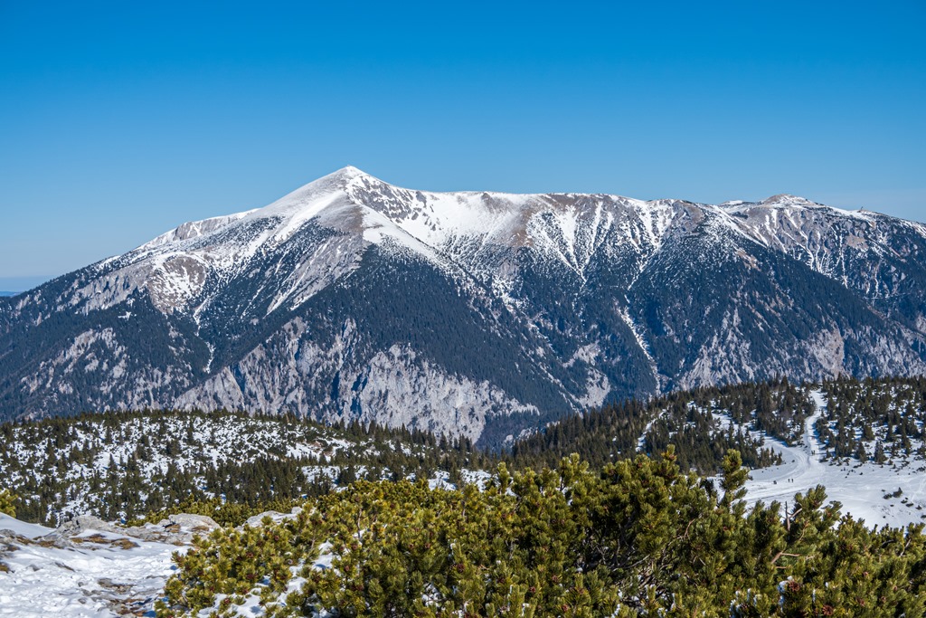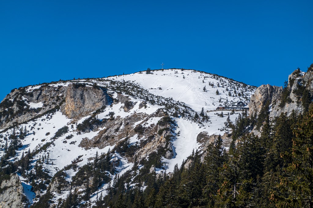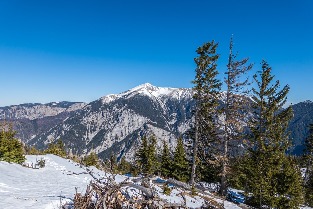 Csodálatos téli nap ígérkezik, enyhe faggyal. Egy gyenge hidegfront hozott 1000 m felett némi havat. A mennyiség feltehetően nem jelentős. A Rax egyik legklasszikusabb túráját választom, hogy elvigyem a Jakobskogel télies skalpját. Mint kiderül olyan rengeteg hó fekszik még a hegyen, hogy az egy-másfél méter magasra nyúló törpefenyők téli álomban szenderegnek a hó alatt. A Jakobskogel szinte bármilyen irányból bevehető.