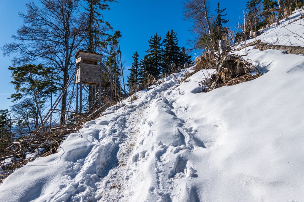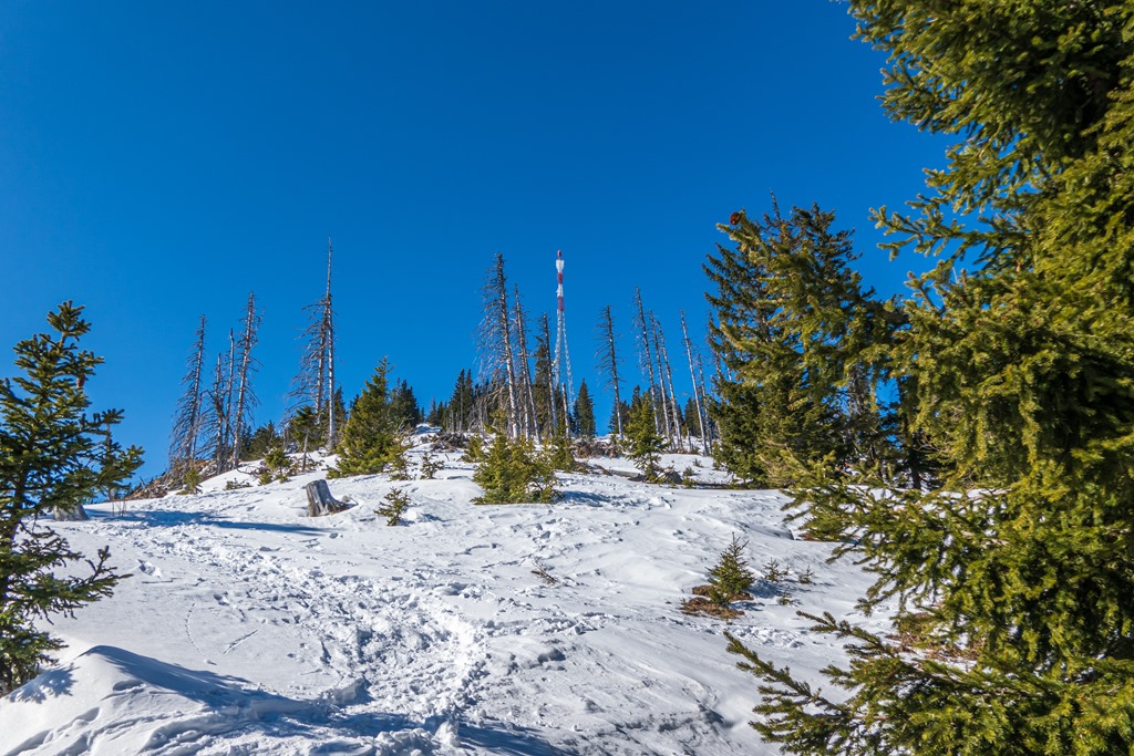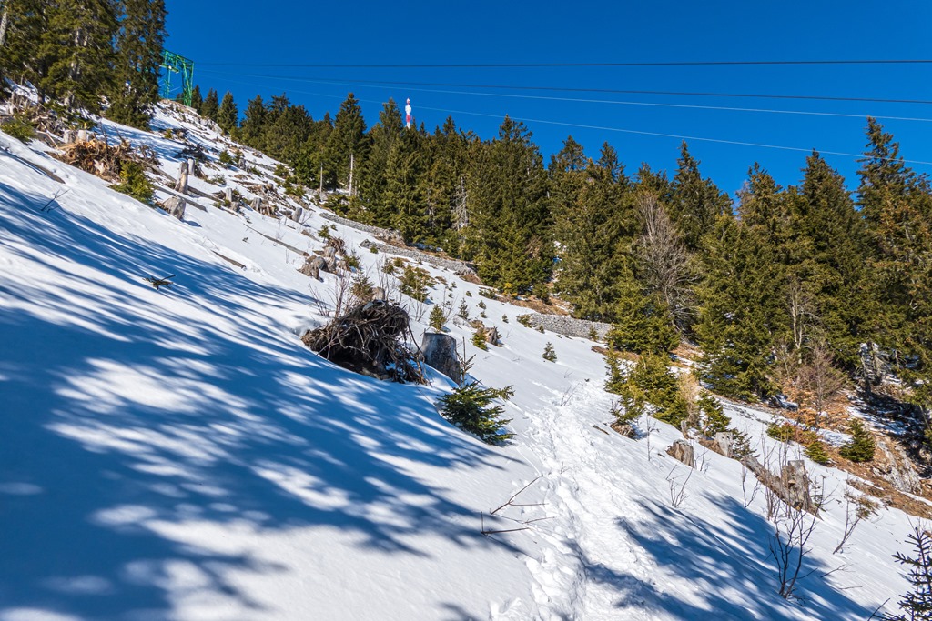 Cirka 1400 m szinten aztán már egységes a hótakaró. Az előttem volt haladók nyoma nem is követei a nyári út fonalát, hanem afféle diretisszimában egyenesen a kabinos felvonó hegyiállomása melletti adótornyot célozza meg (fenti kép). Ott lyukadok ki a platón, mármint eme vaskonstrukció talpazatánál.